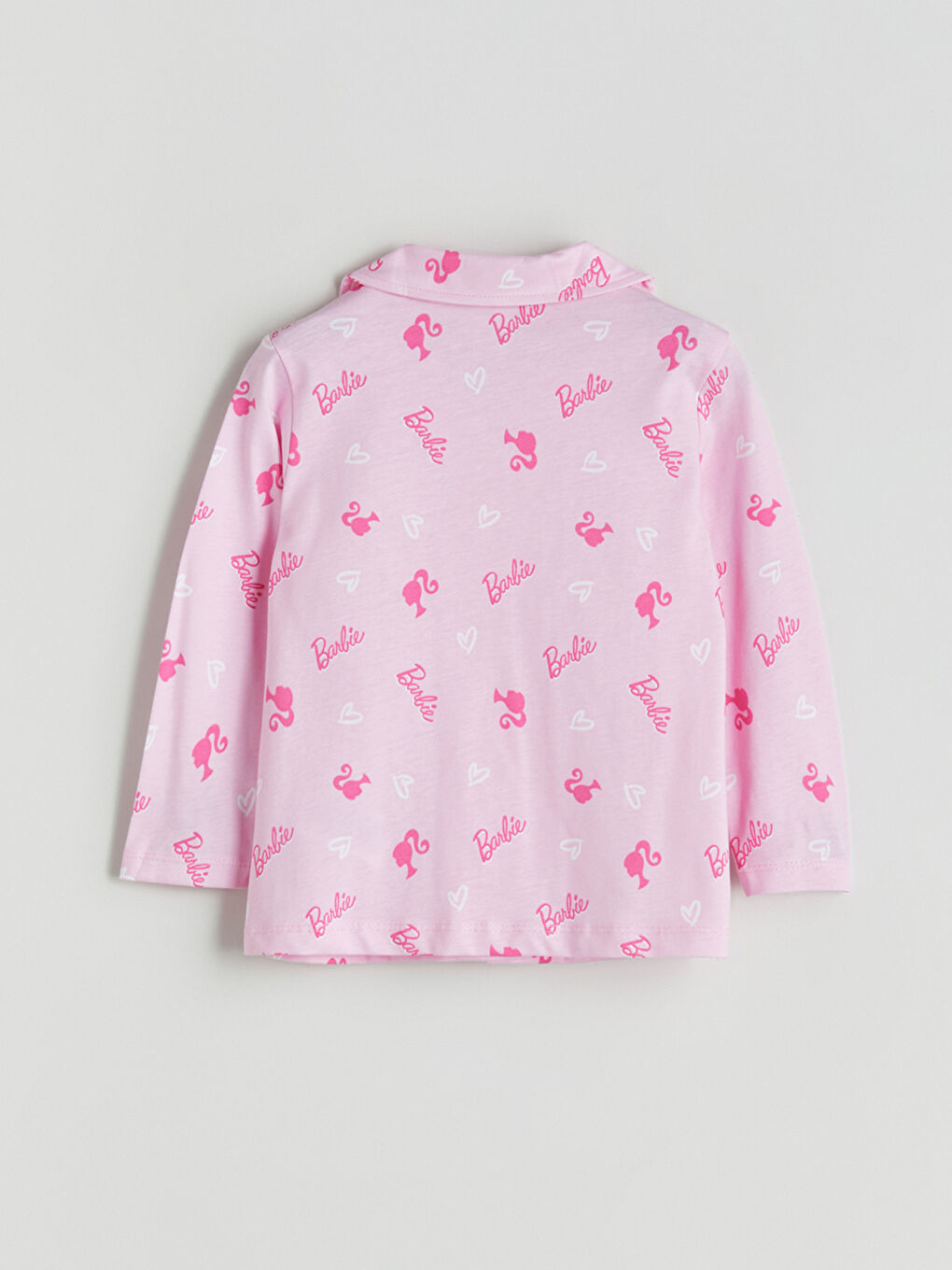 تاپ پیژامه دخترانه دارای مجوز باربی، یقه هفت و آستین بلند. طرح‌دار، پارچه ۱۰۰٪ پنبه‌ای با جلو دکمه‌دار.