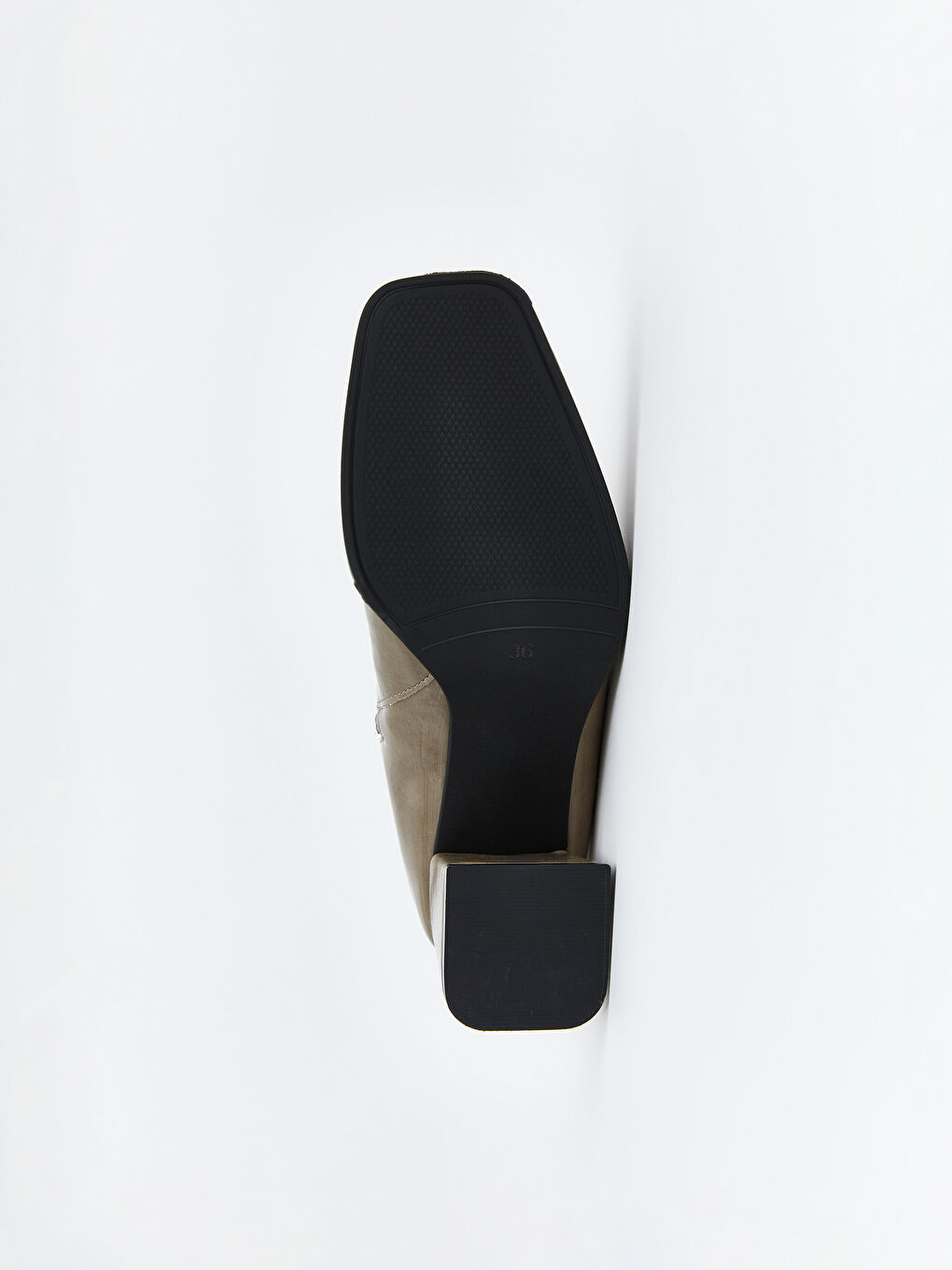 نیم بوت زنانه با پاشنه بلوکی و پنجه مربعی، دارای زیپ کناری است.