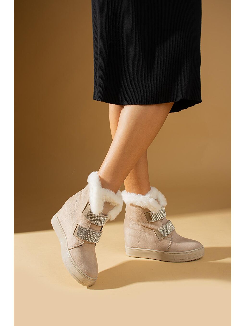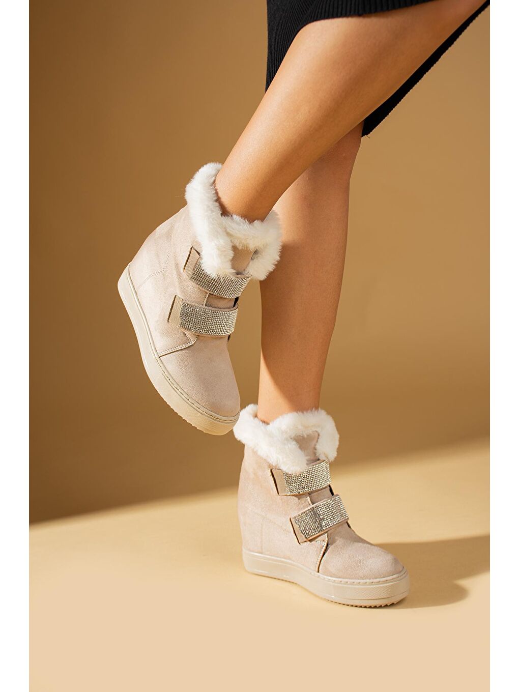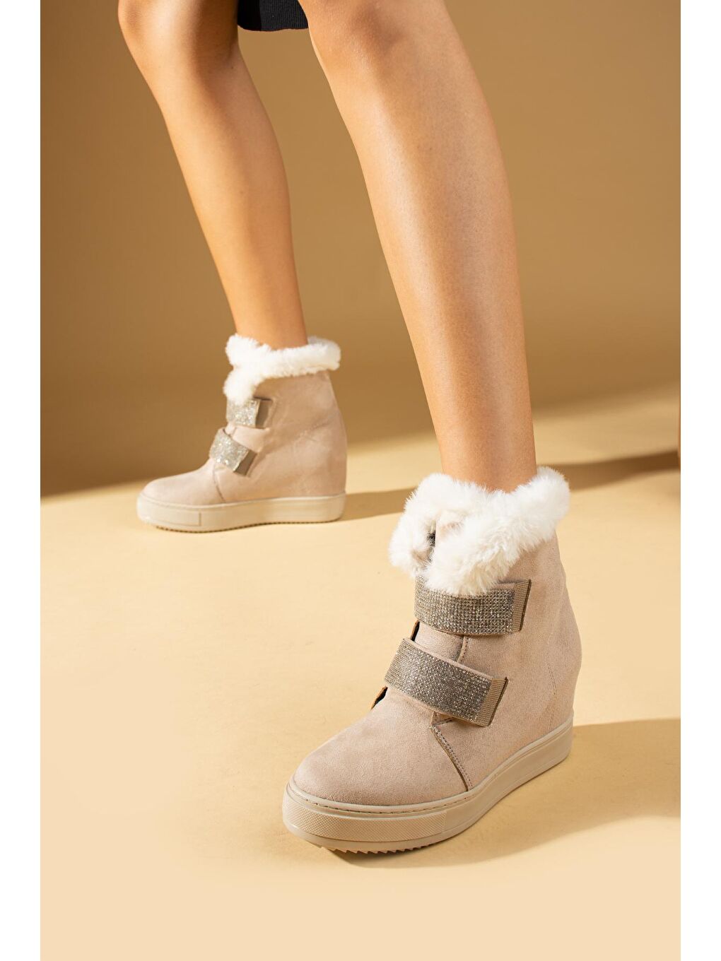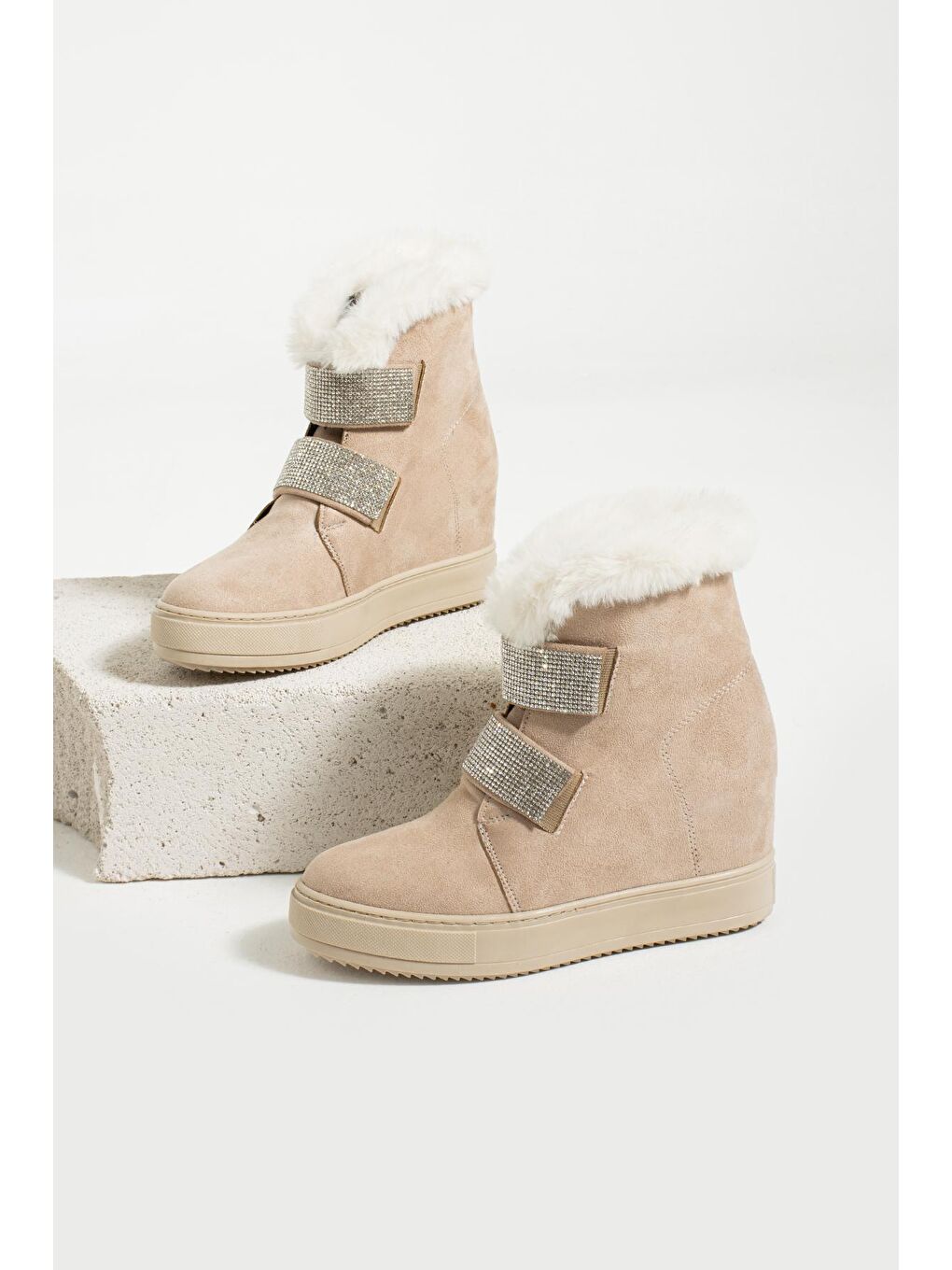 چکمه و نیم بوت زنانه پاشنه مخفی، راحت، آستر خزدار بژ، جنس جیر، کد ۴۳-۴۱۵-۲۳