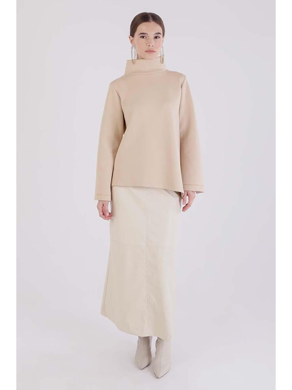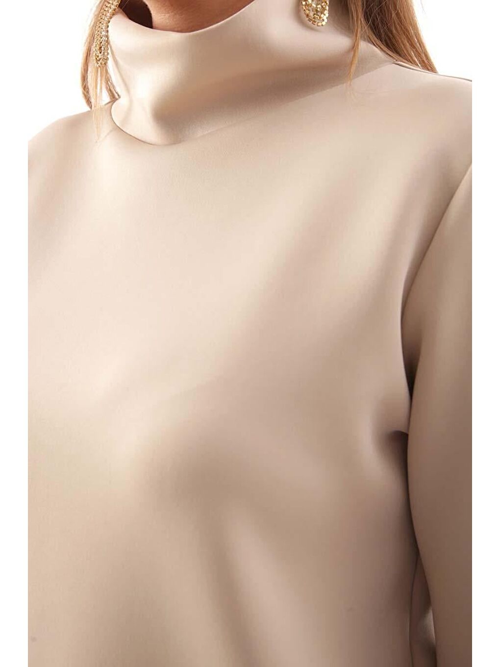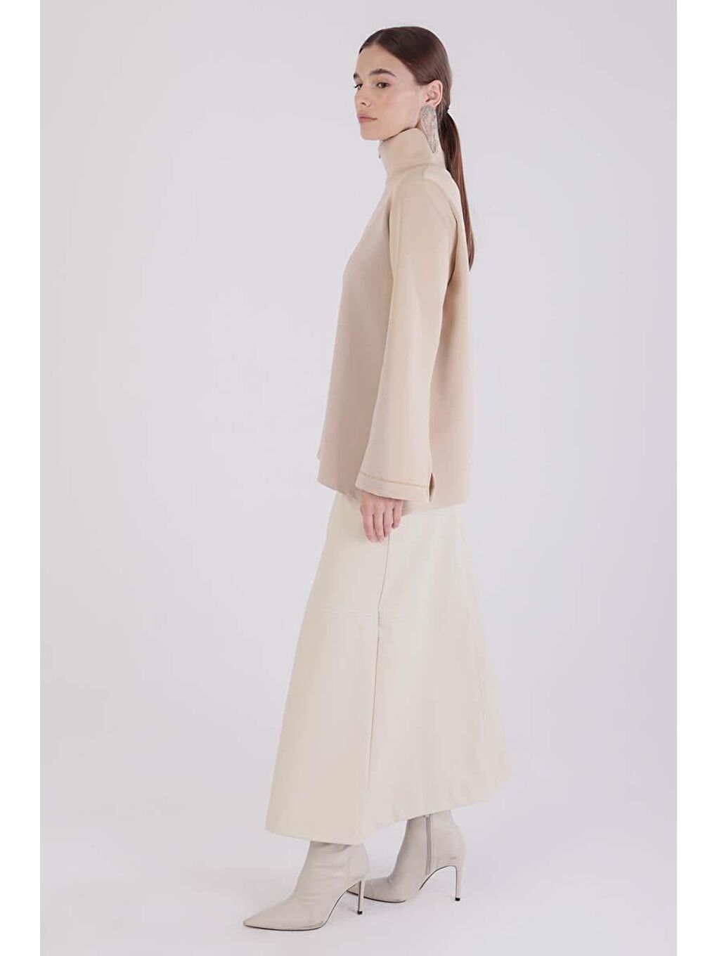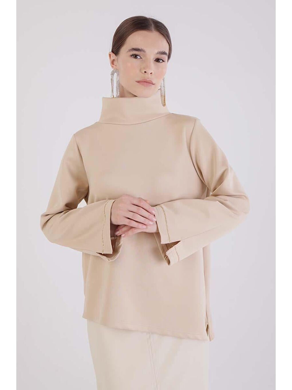 بلوز غواصی یقه ایستاده بژ با آستین‌های چاک‌دار