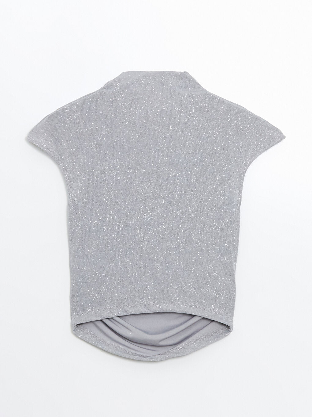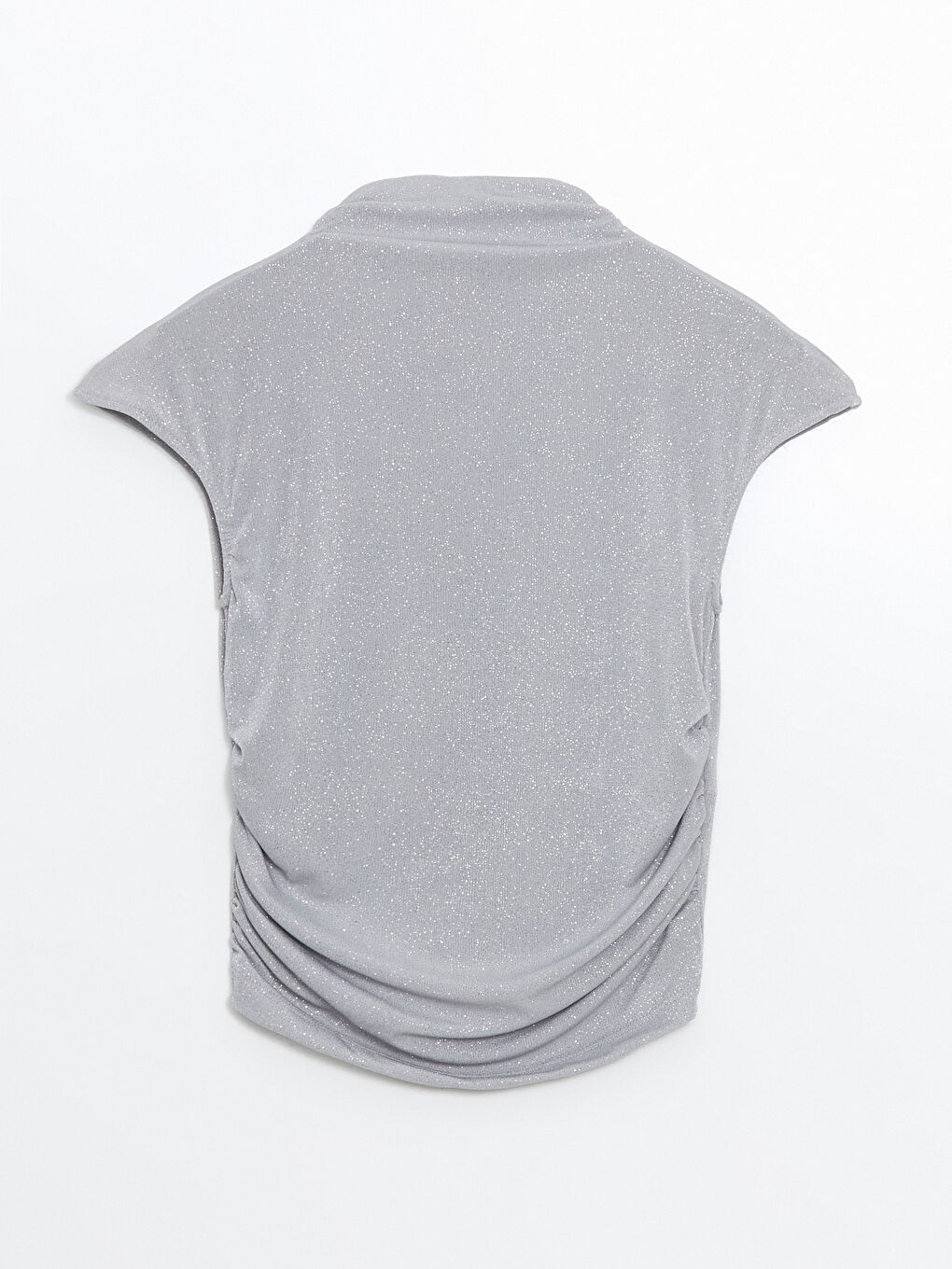 این بلوز زنانه، یقه ایستاده و آستین کوتاه، دارای طرح چین‌دار در کناره‌ها است. از پارچه راشل براق دوخته شده است.