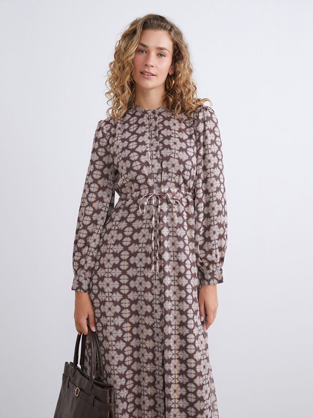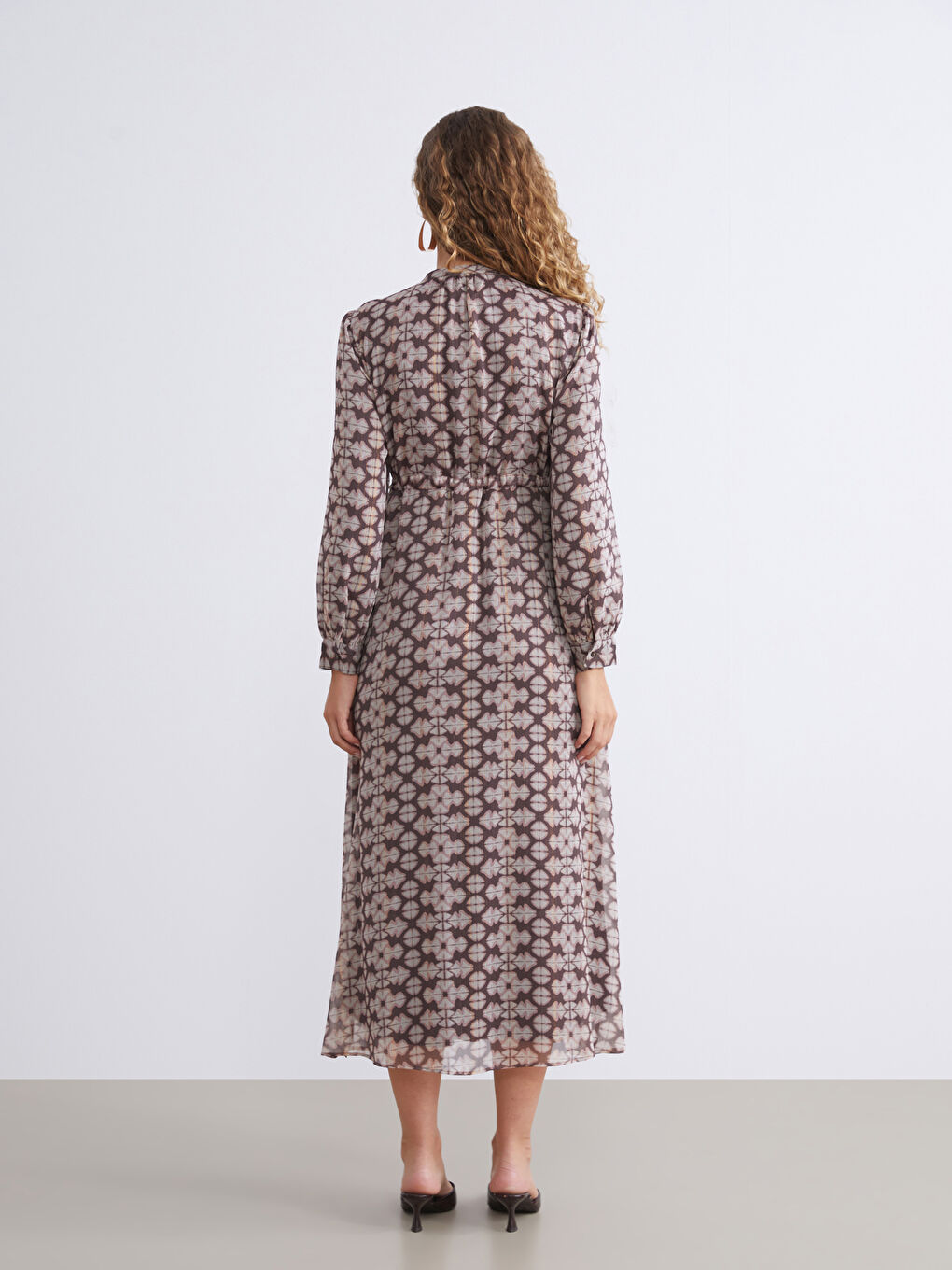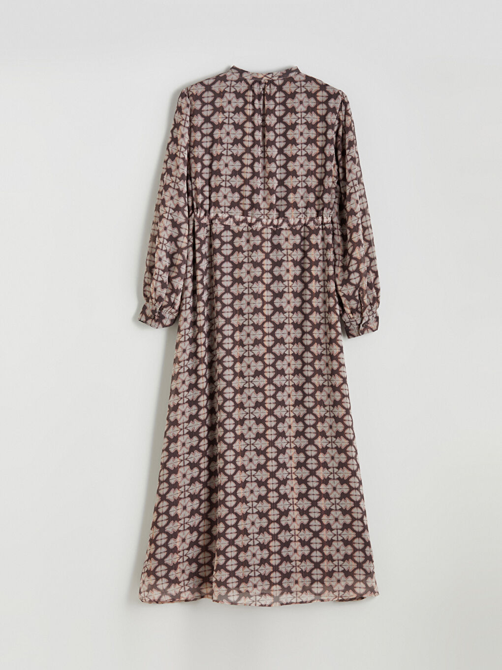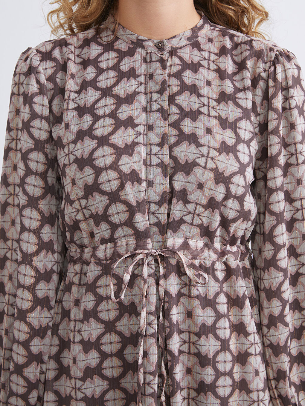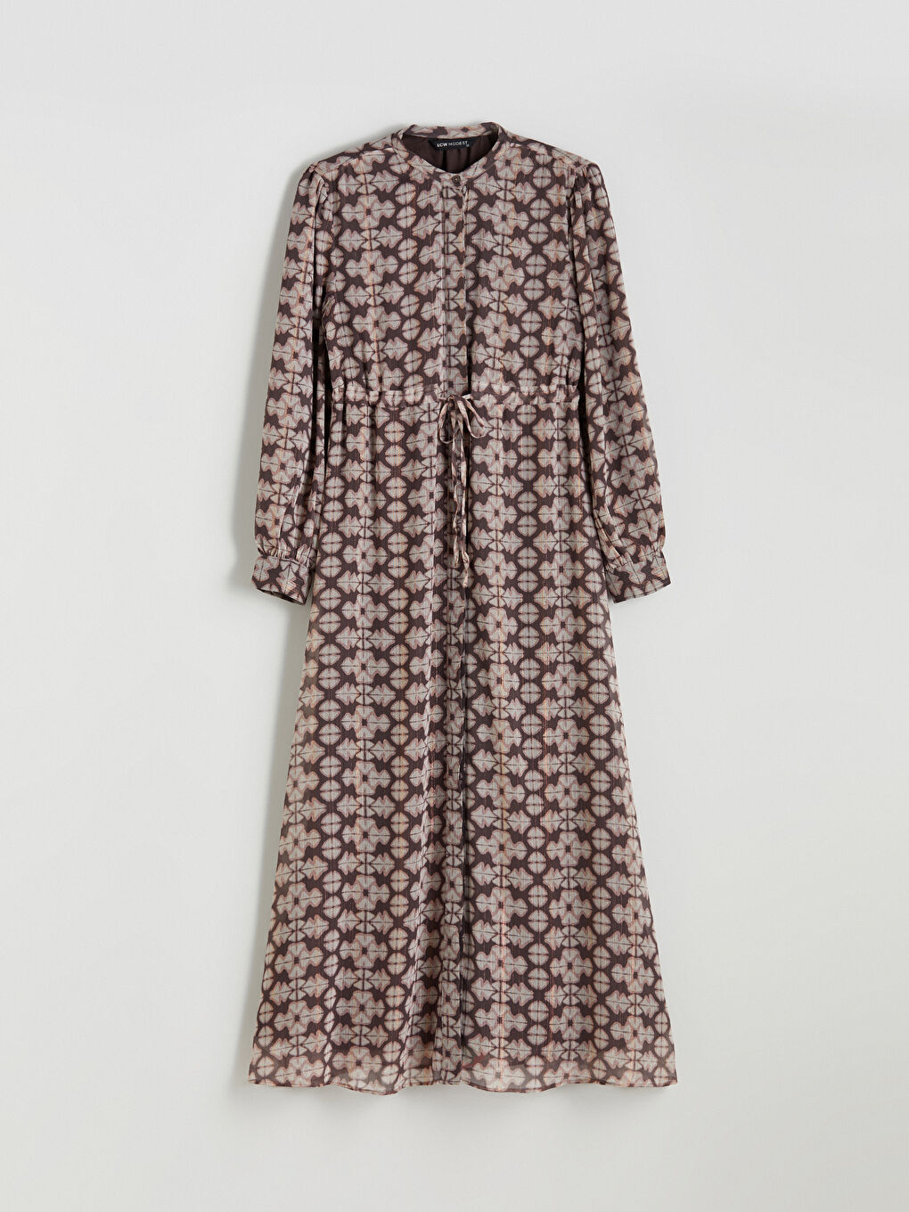 این لباس زنانه آستین بلند، یقه گرد، از پارچه شیفون دوخته شده است. دارای دکمه مخفی در جلو و کمر کشی با بند قابل تنظیم است.