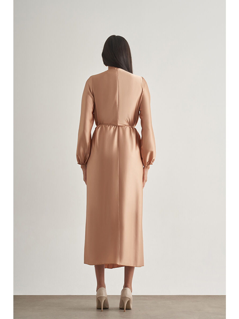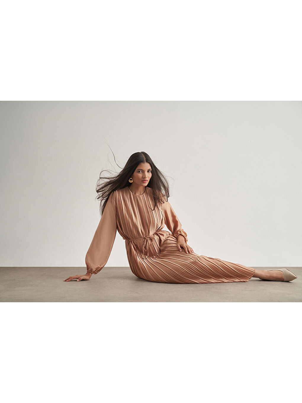 لباس مجلسی ماکسی پلیسه ظریف ساتن بافتدار بژ