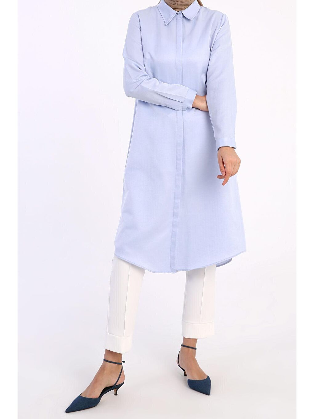 پیراهن بلند آبی ساده با چاک مخفی