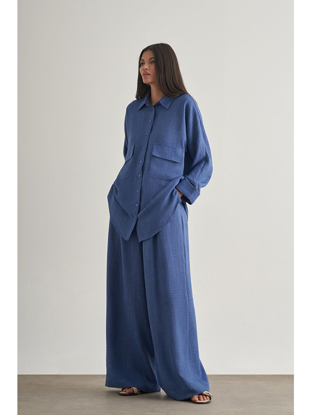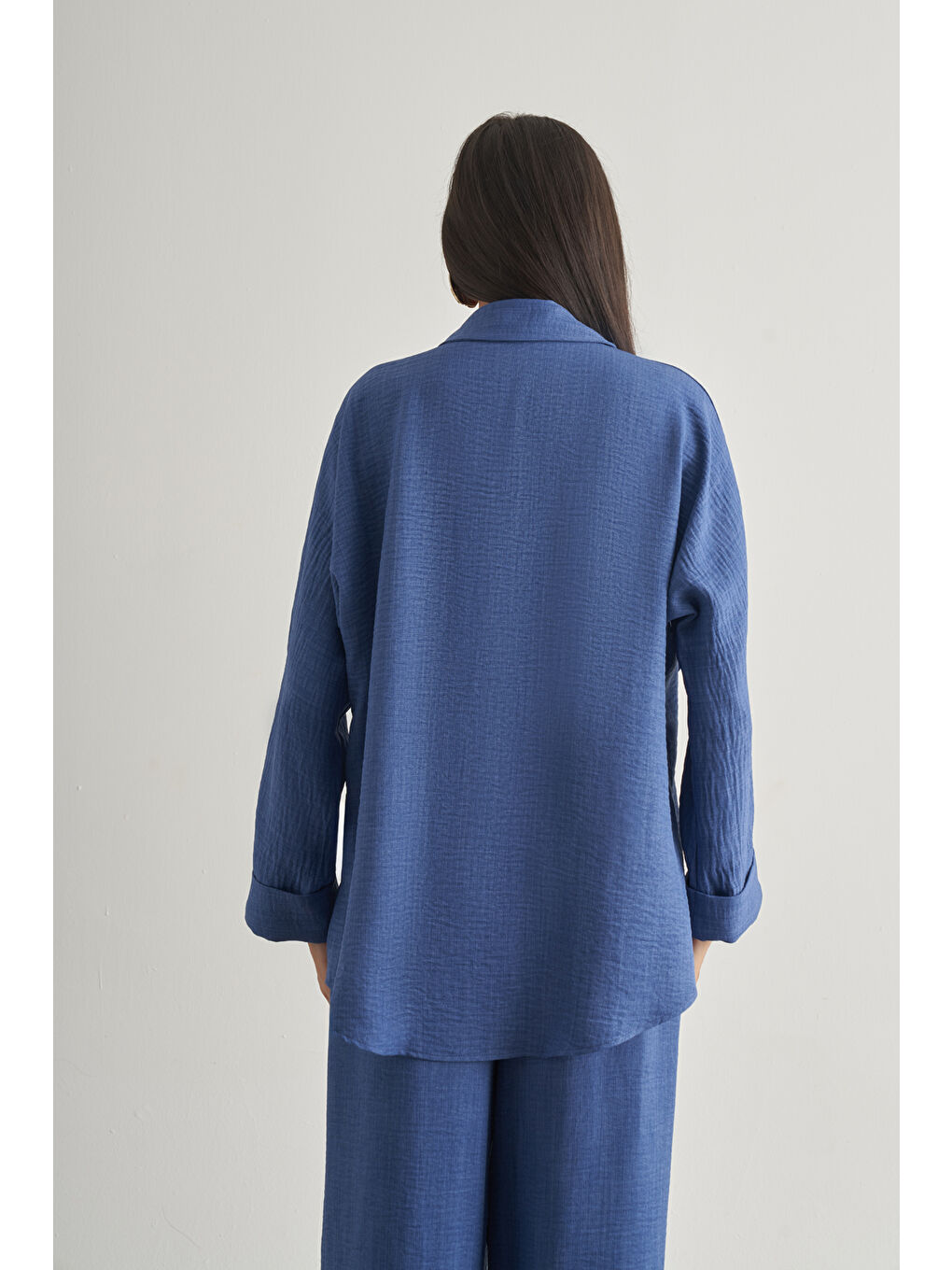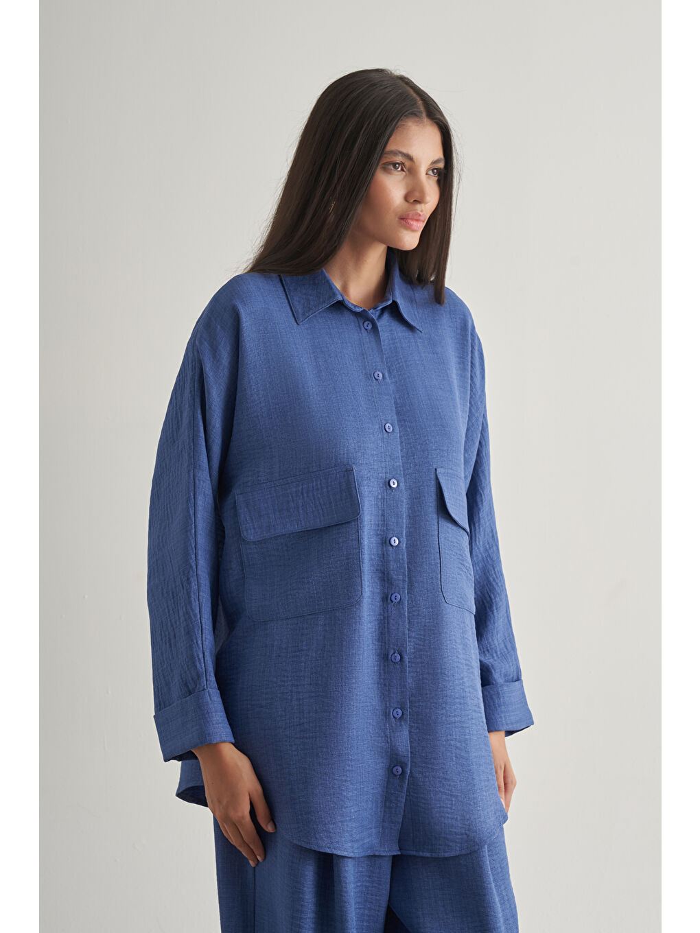 تونیک جیبدار آبی نیلی بافتدار از جنس کتان