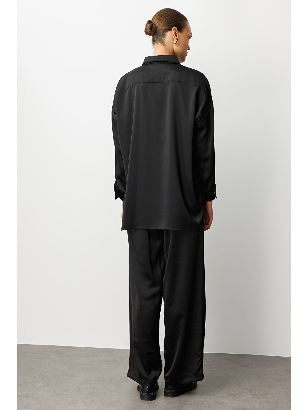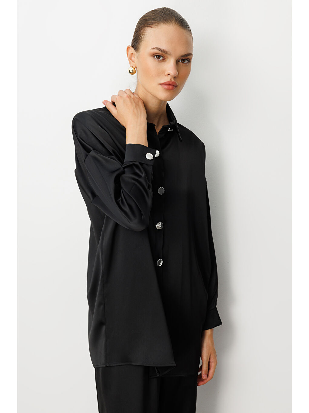 پیراهن تونیک ساتن مشکی با دکمههای فلزی