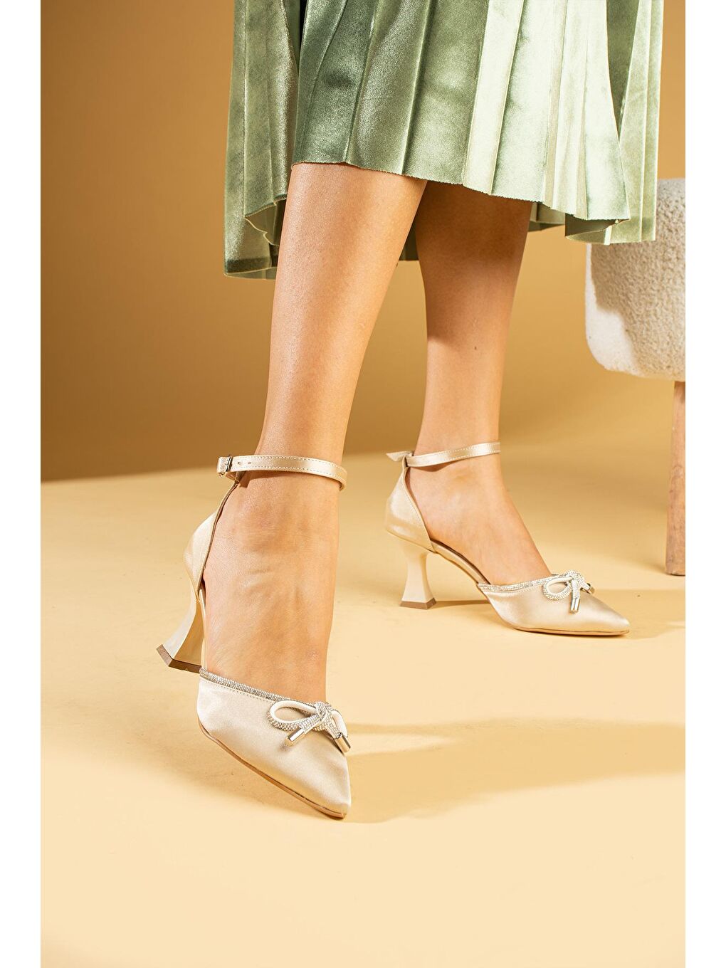 کفش زنانه پاشنه بلند شیشه‌ای طرح پاپیون سنگی بژ، ساتن، کد 018-52-24