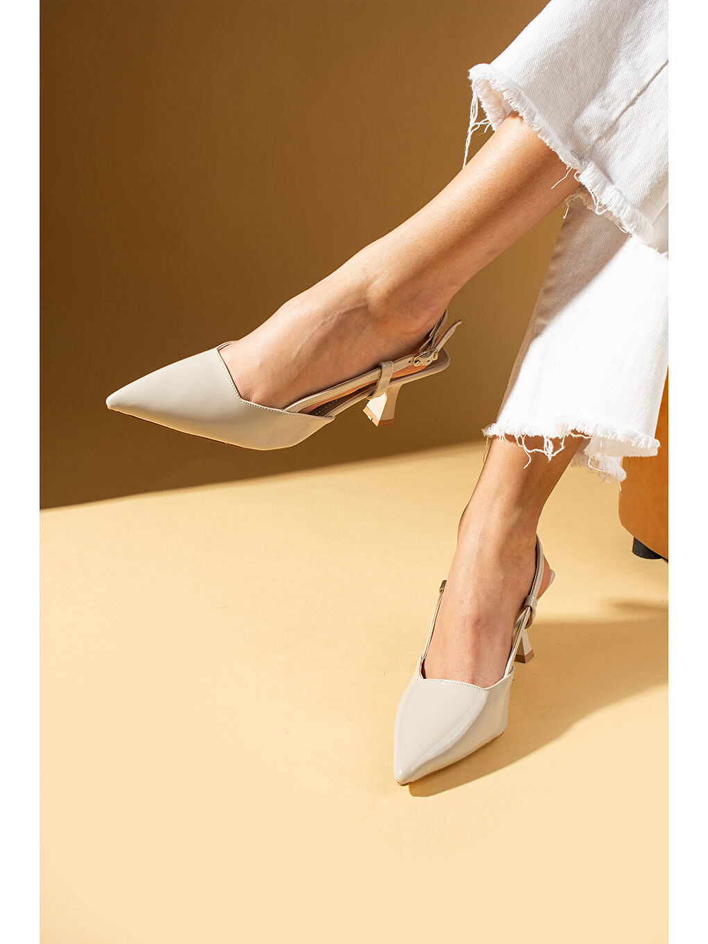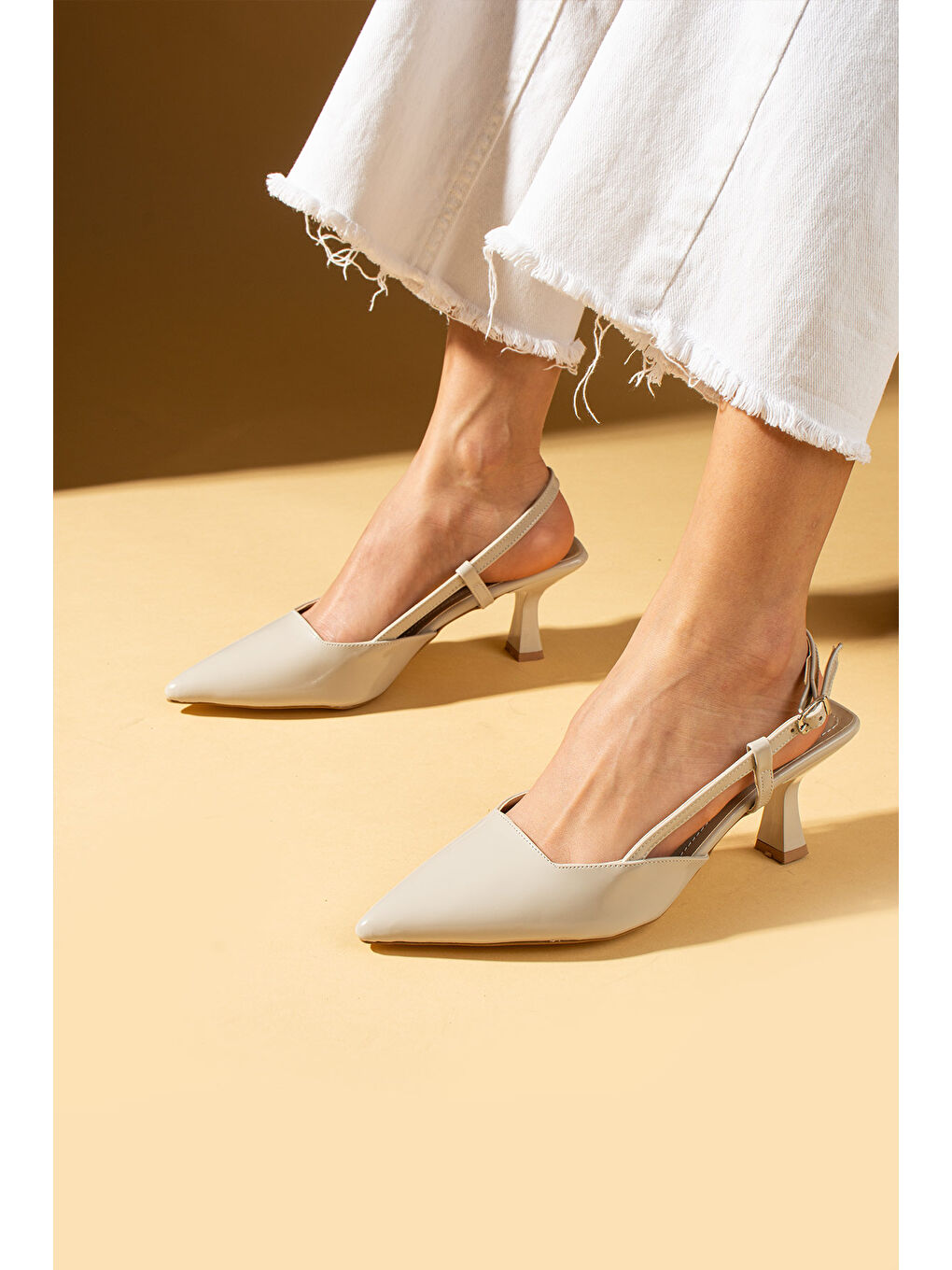 کفش زنانه پاشنه بلند با بند و پنجه تیز بژ، چرم ورنی، مدل ۷۱-۲۷۸-۲۵