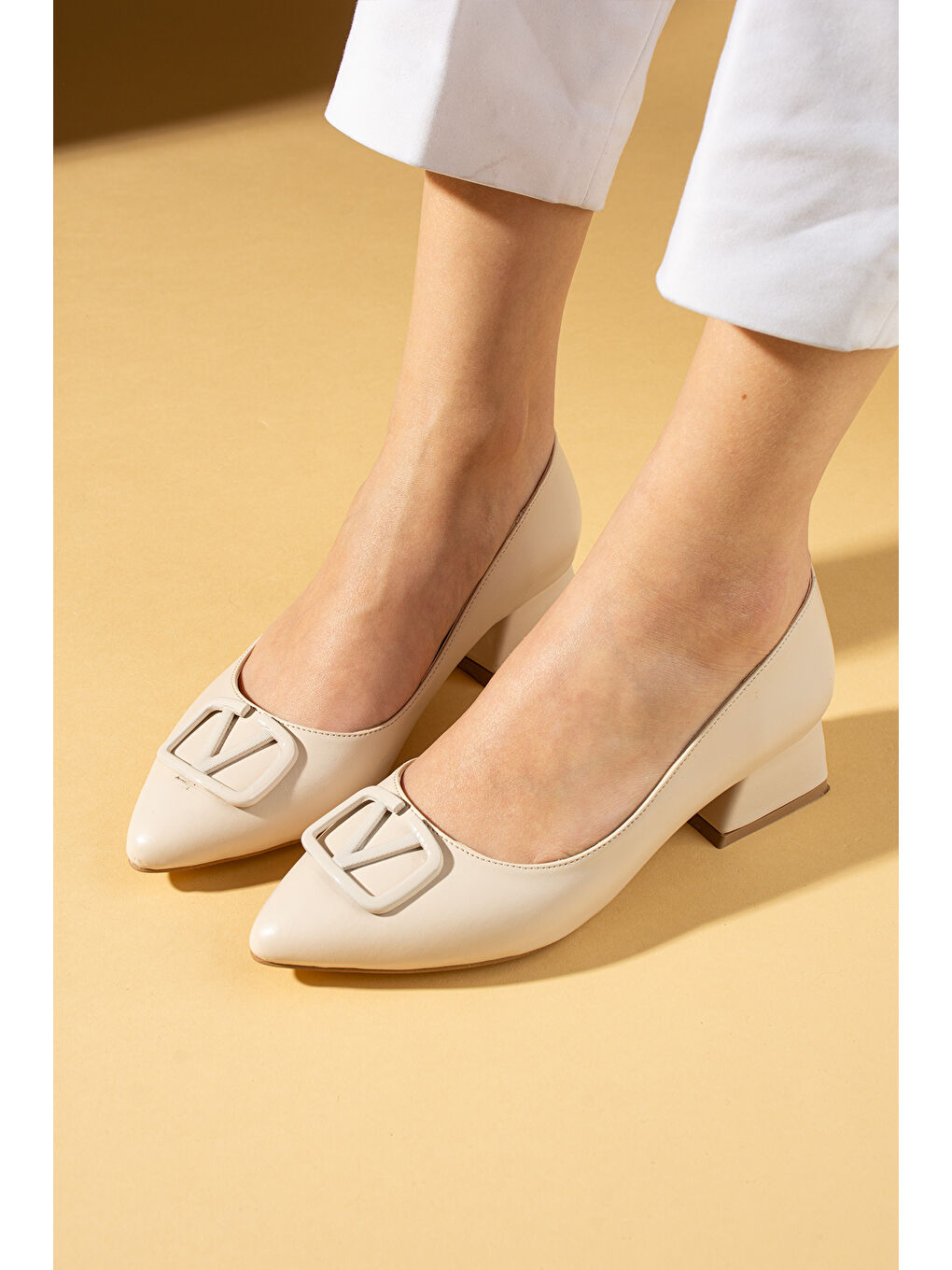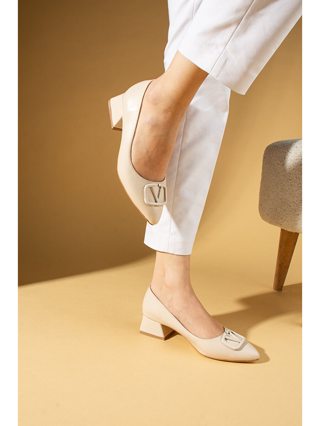 کفش زنانه بژ V سگک‌دار پاشنه کوتاه ضخیم نوک‌تیز 018-184-25
