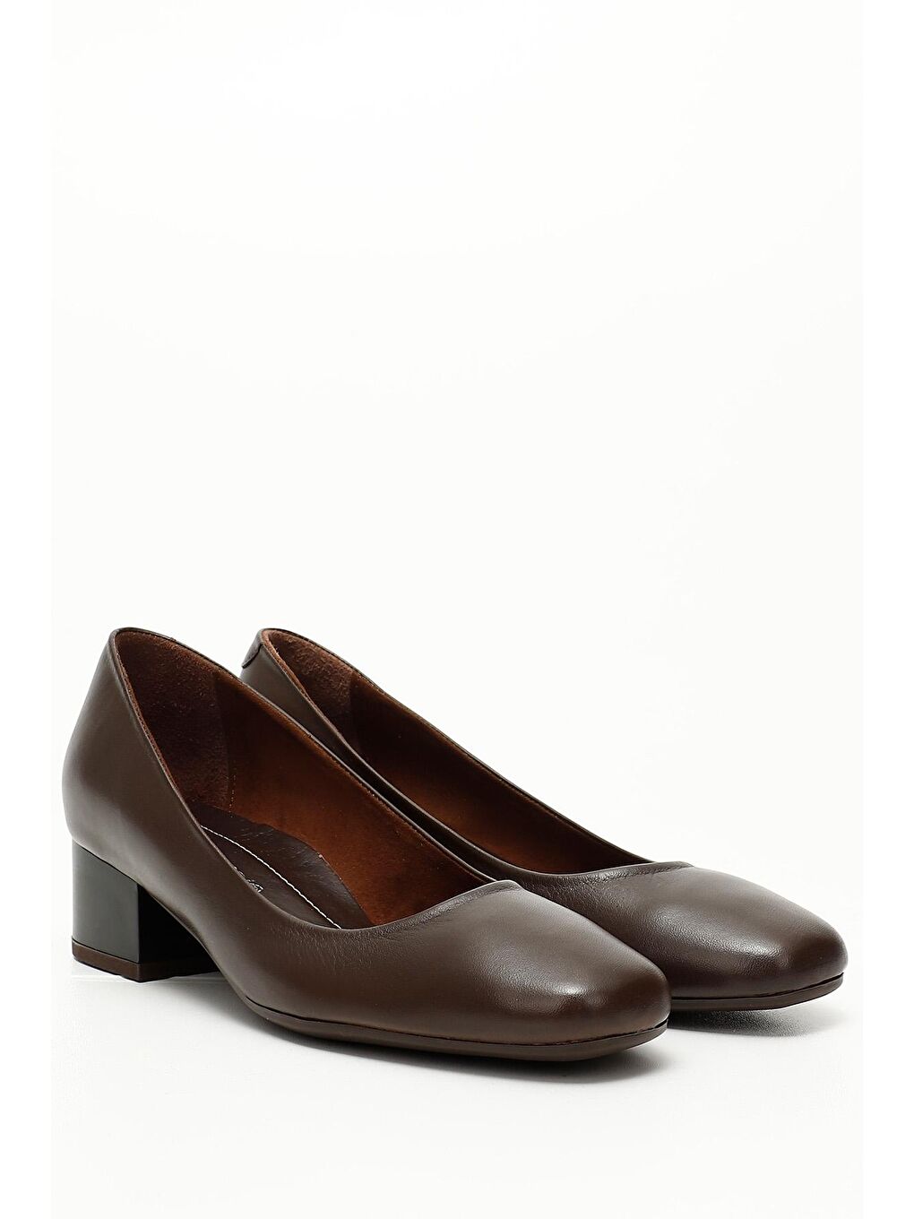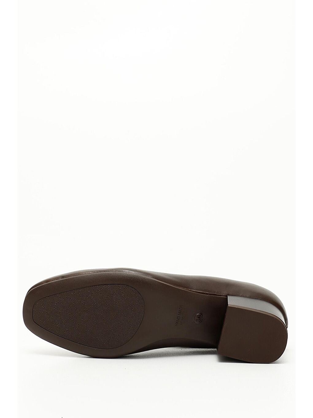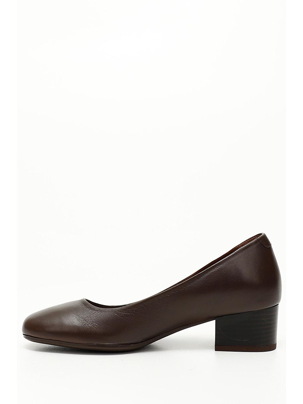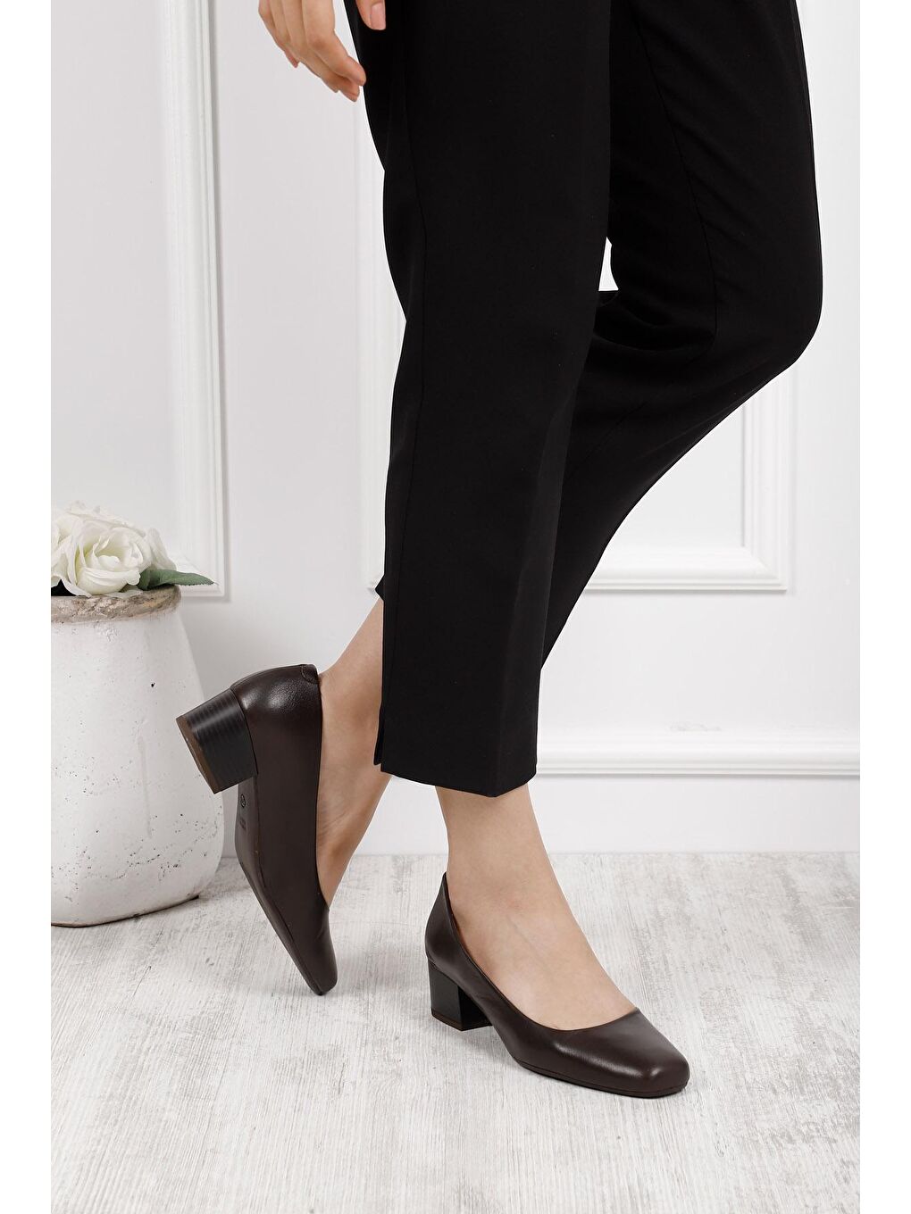 کفش زنانه قهوه‌ای تیره، چرم اصل، نوک گرد، پاشنه کوتاه و ضخیم، کد ۲۴۱۰۰