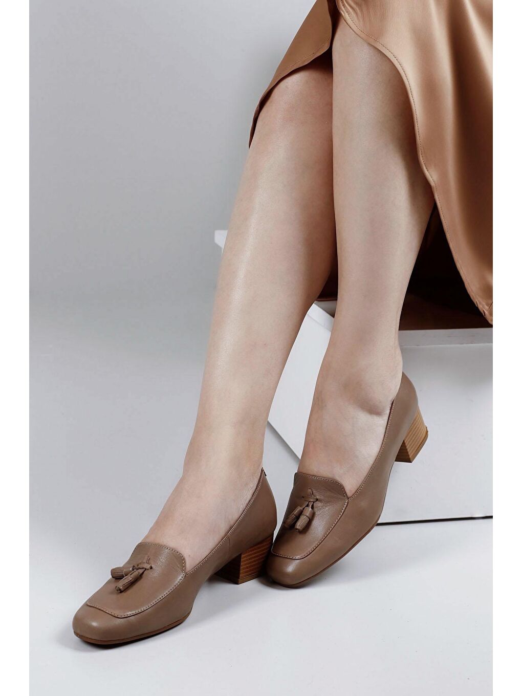 کفش زنانه چرم اصل مینک بژ، پاشنه کوتاه، ضخیم، منگولهدار، کد ۱۳۳۱۳