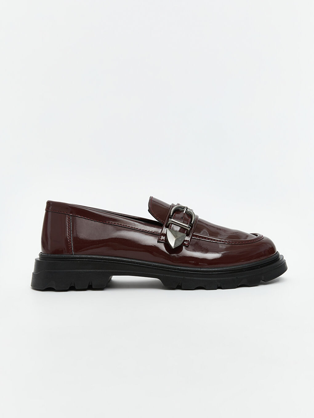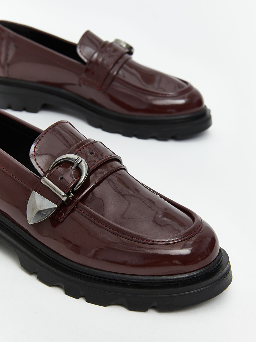 کفشهای راحتی زنانه با نوک گرد و روکش براق، دارای جزئیات سگکدار روی بند جلویی و کفی ضخیم و دندانهدار هستند.