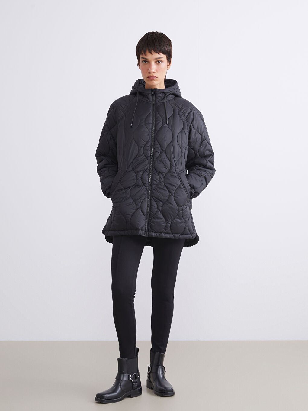 کاپشن پافر زنانه با کلاه ثابت و یقه ایستاده، طرح لحافی، زیپ جلو، آستین بلند و جیب.