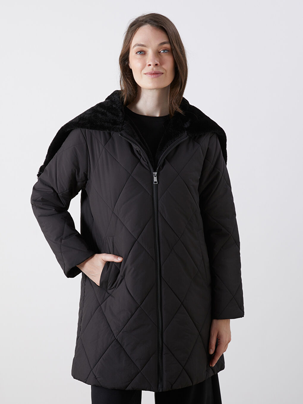 کاپشن پافر زنانه با آستر خزدار، کلاه جداشونده، پارچه طرح لوزی، آستین بلند و زیپ جلو.