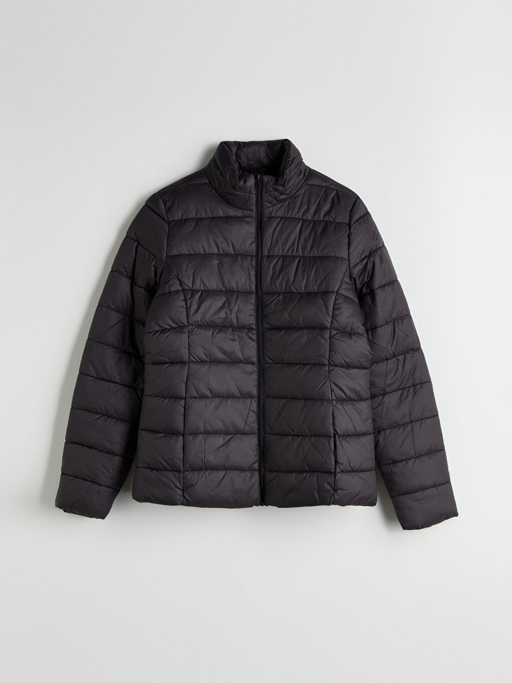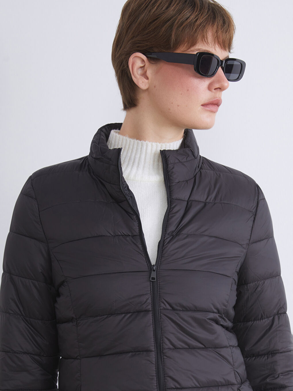 کاپشن پفی زنانه با یقه ایستاده و آستین بلند، دوخت لحافی، زیپ جلو و جیبهای کناری.
