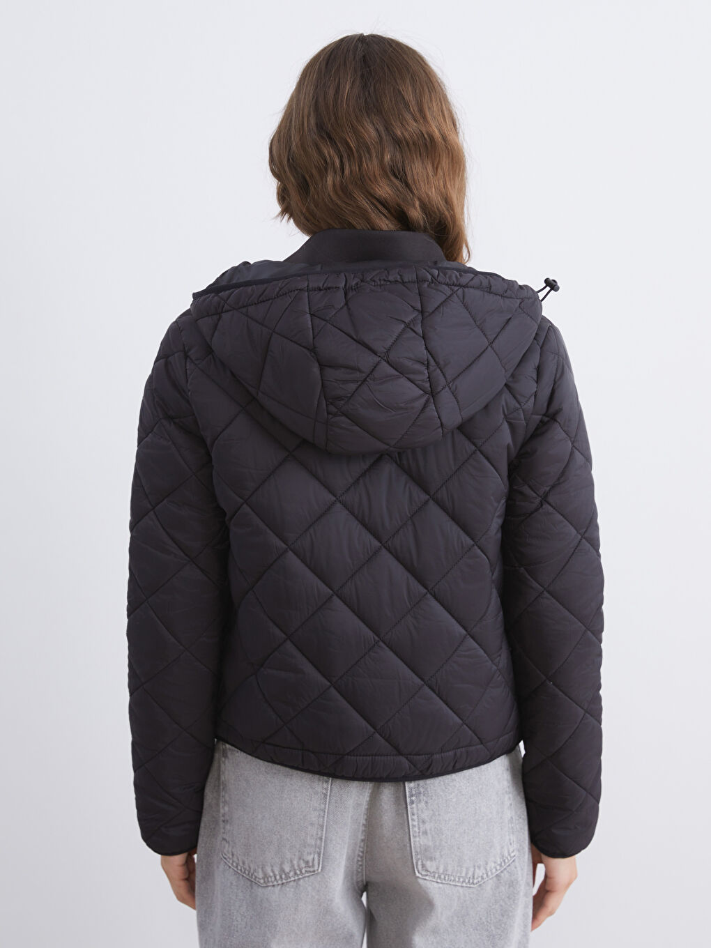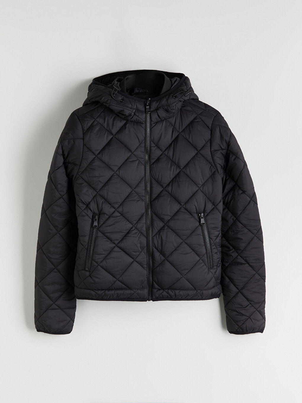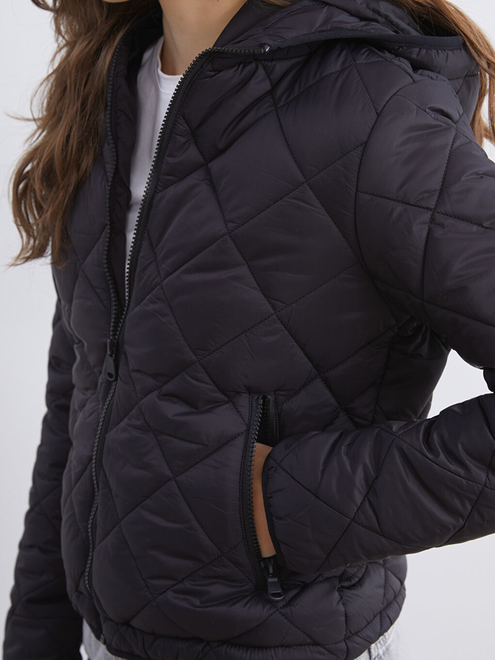 پالتوی زنانه لحاف دوزی شده با طرح لوزی، کلاه دار و یقه ایستاده، زیپ جلو و جیب های زیپ دار کناری.