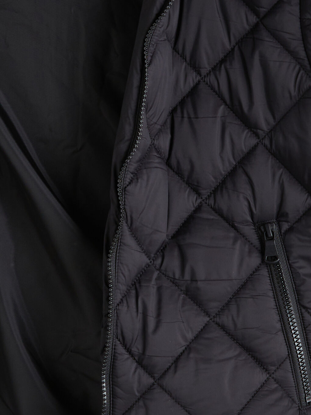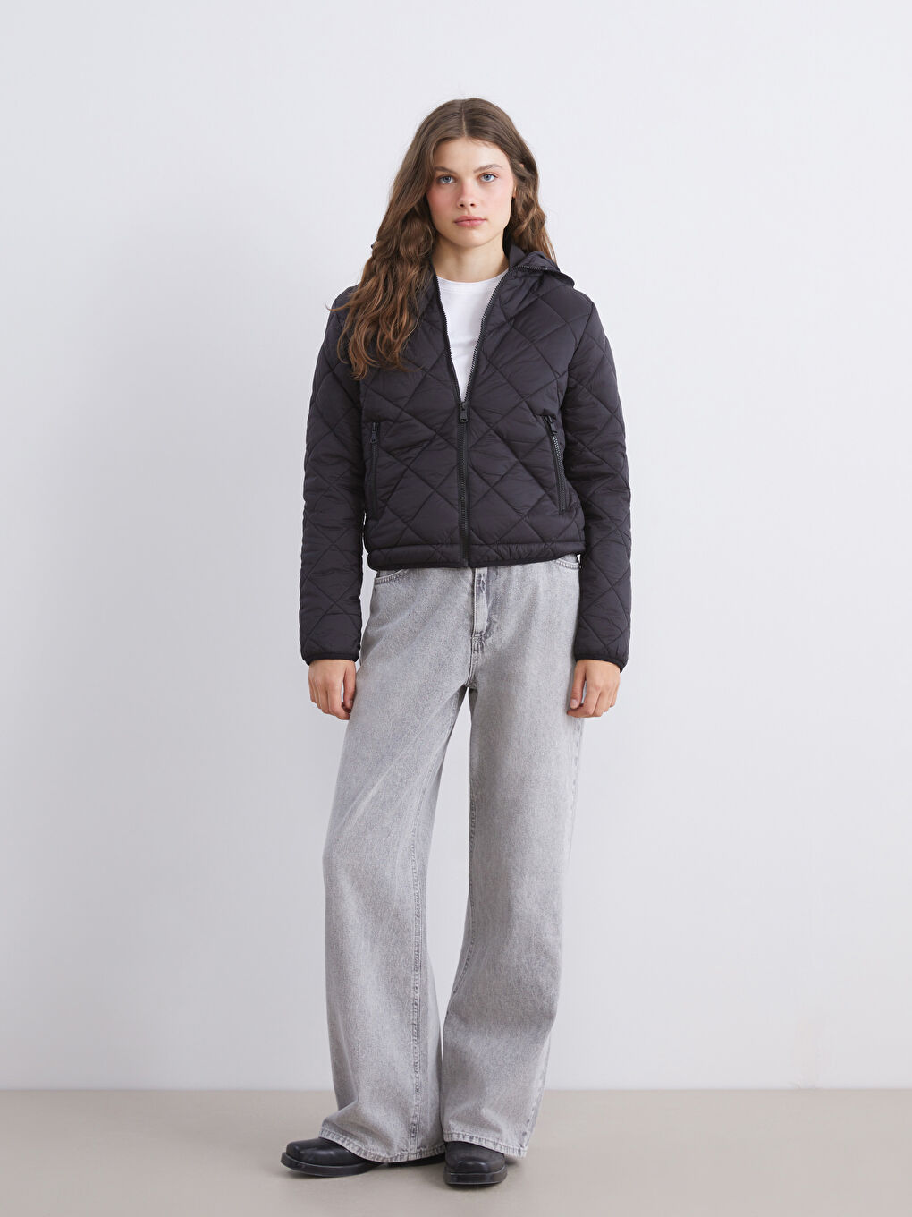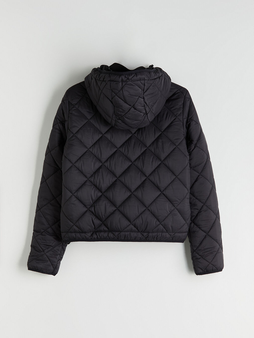 پالتوی زنانه لحاف دوزی شده با طرح لوزی، کلاه دار و یقه ایستاده، زیپ جلو و جیب های زیپ دار کناری.