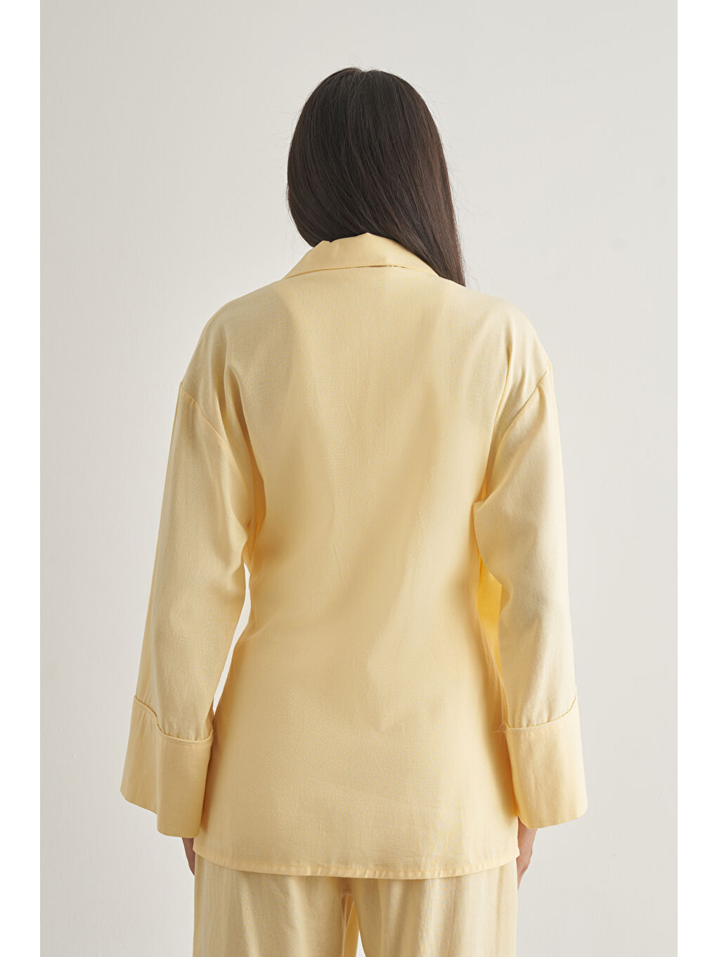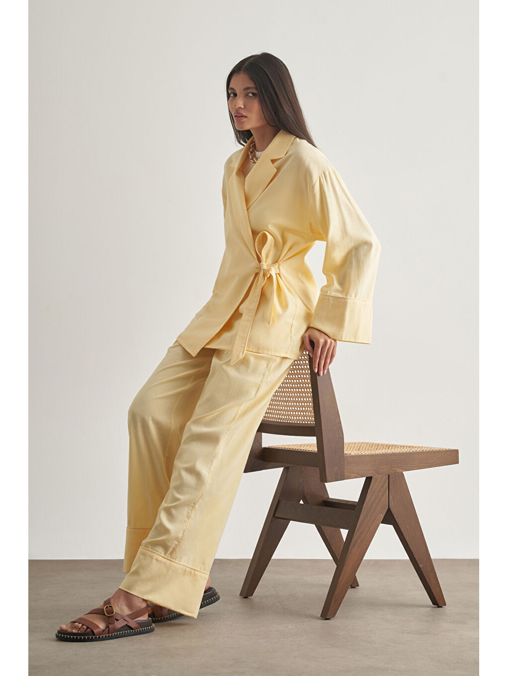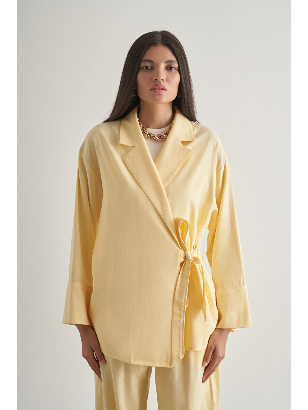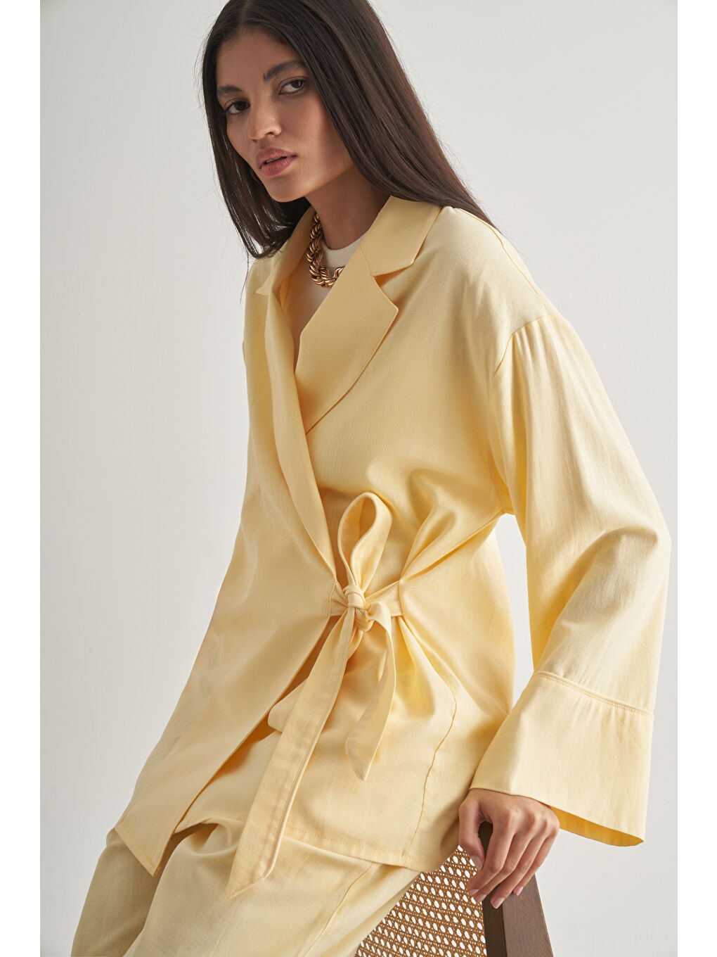 ژاکت کیمونوی زرد رنگ طرح لینن مدل Wrap-Tied