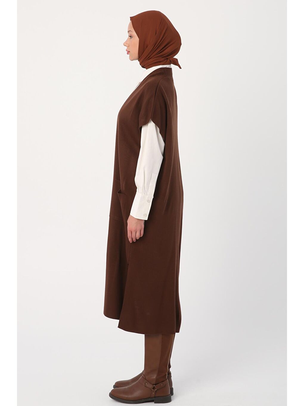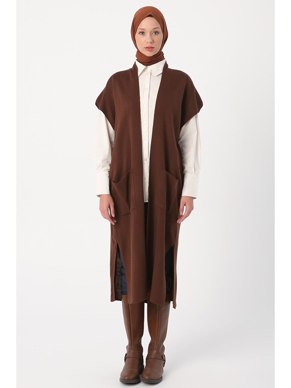جلیقه بافتنی بلند قهوه‌ای جیب‌دار