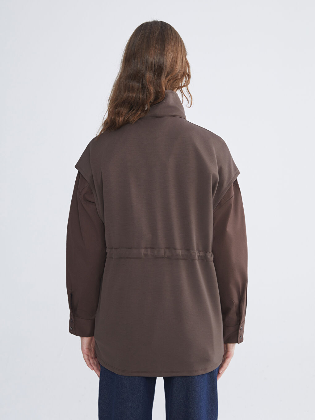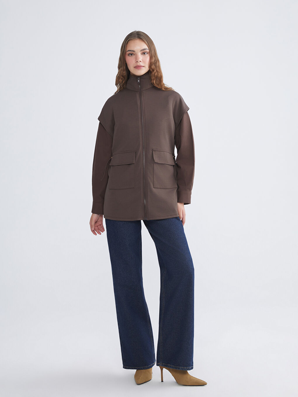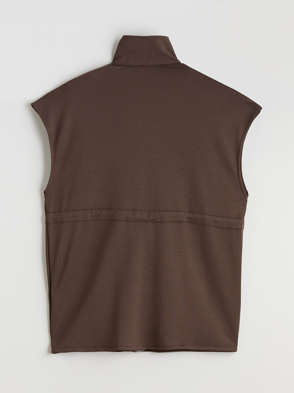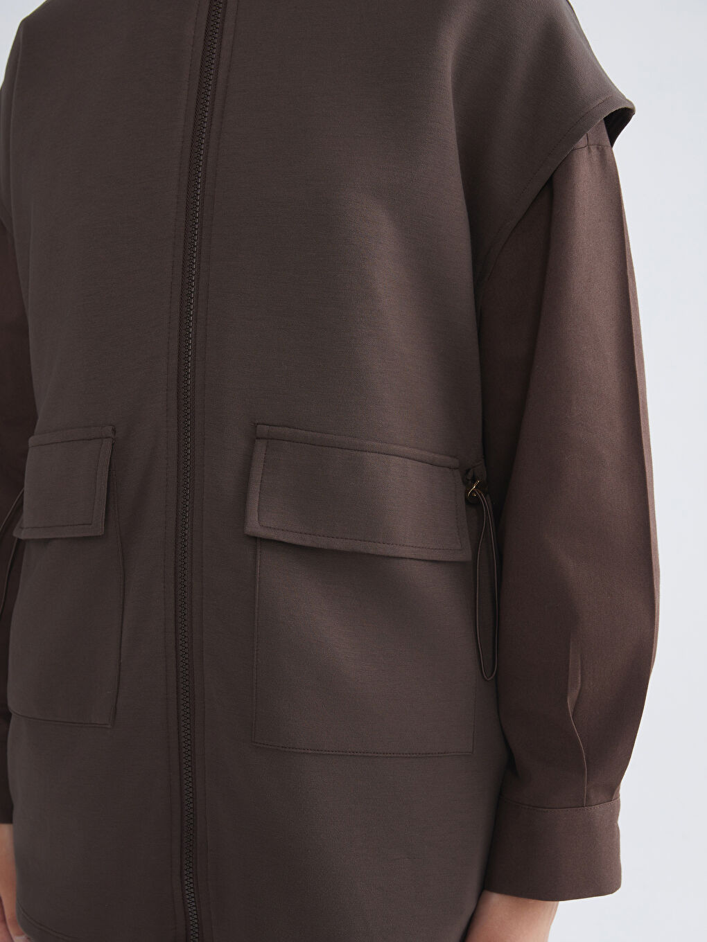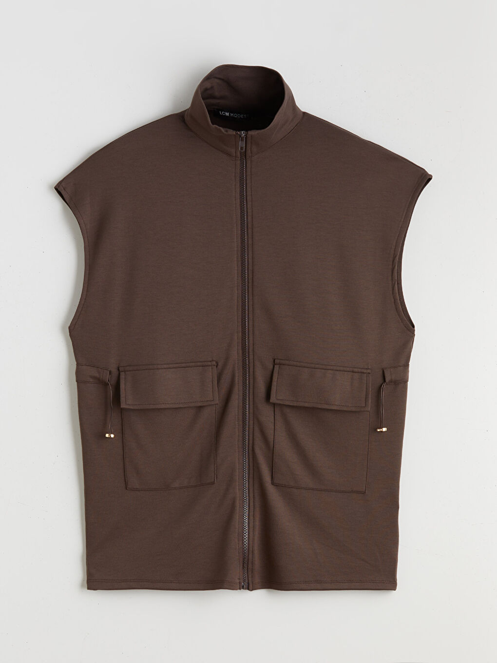 جلیقه زنانه بدون آستین با یقه ایستاده و زیپ جلو. دارای چینهای کناری و دو جیب جلو با لبههای تاشو است.
