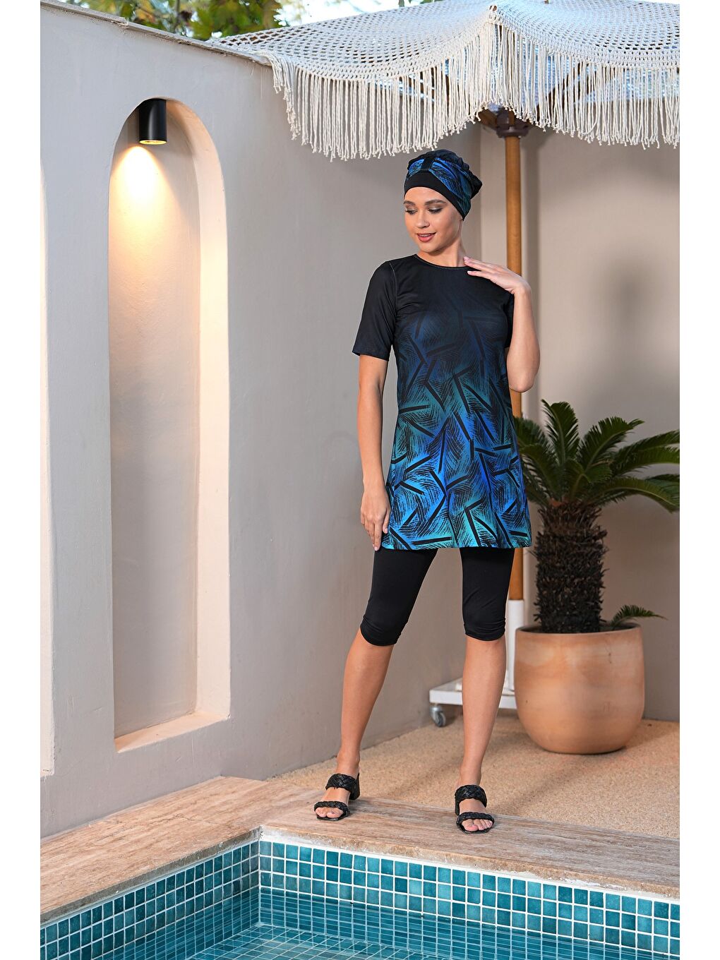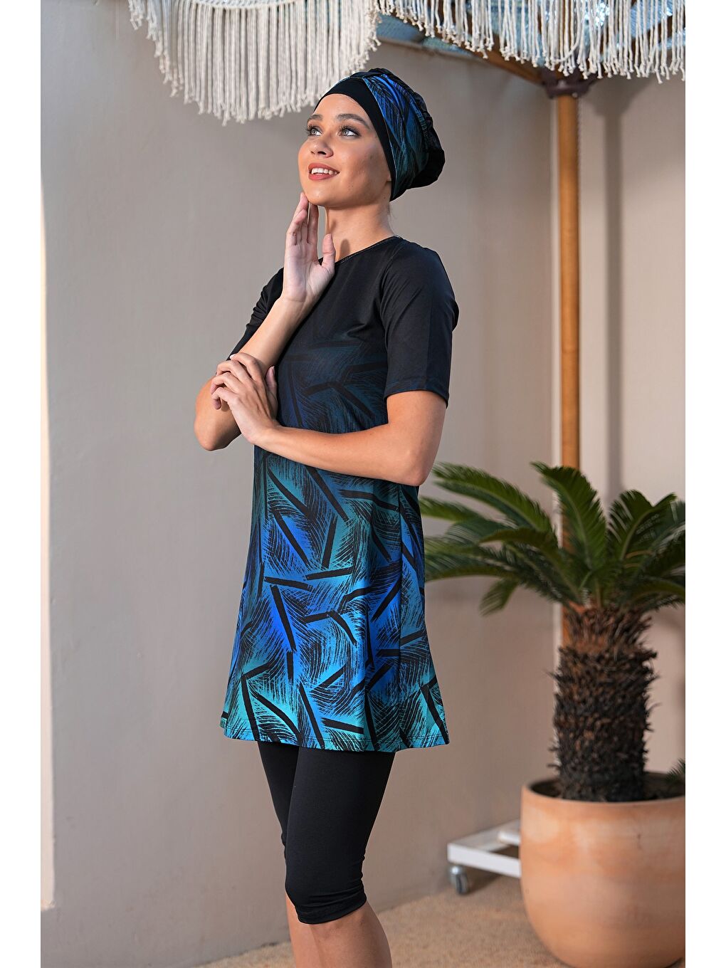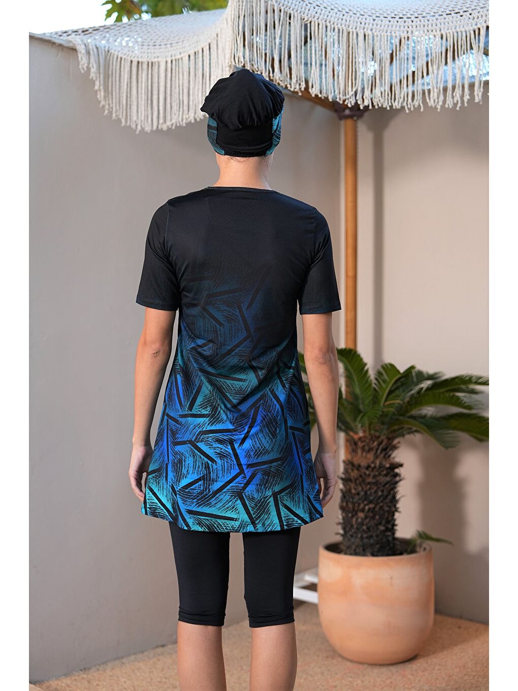 لباس شنا حجاب نیمه پوشیده طرح دار آستین کوتاه مشکی ۳۱۹۰