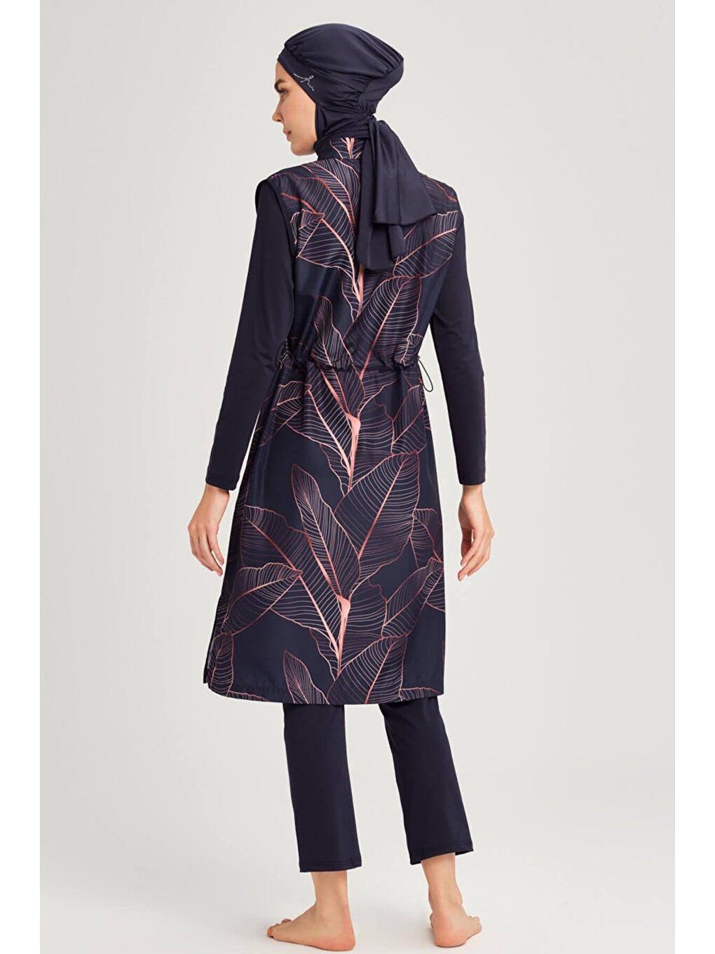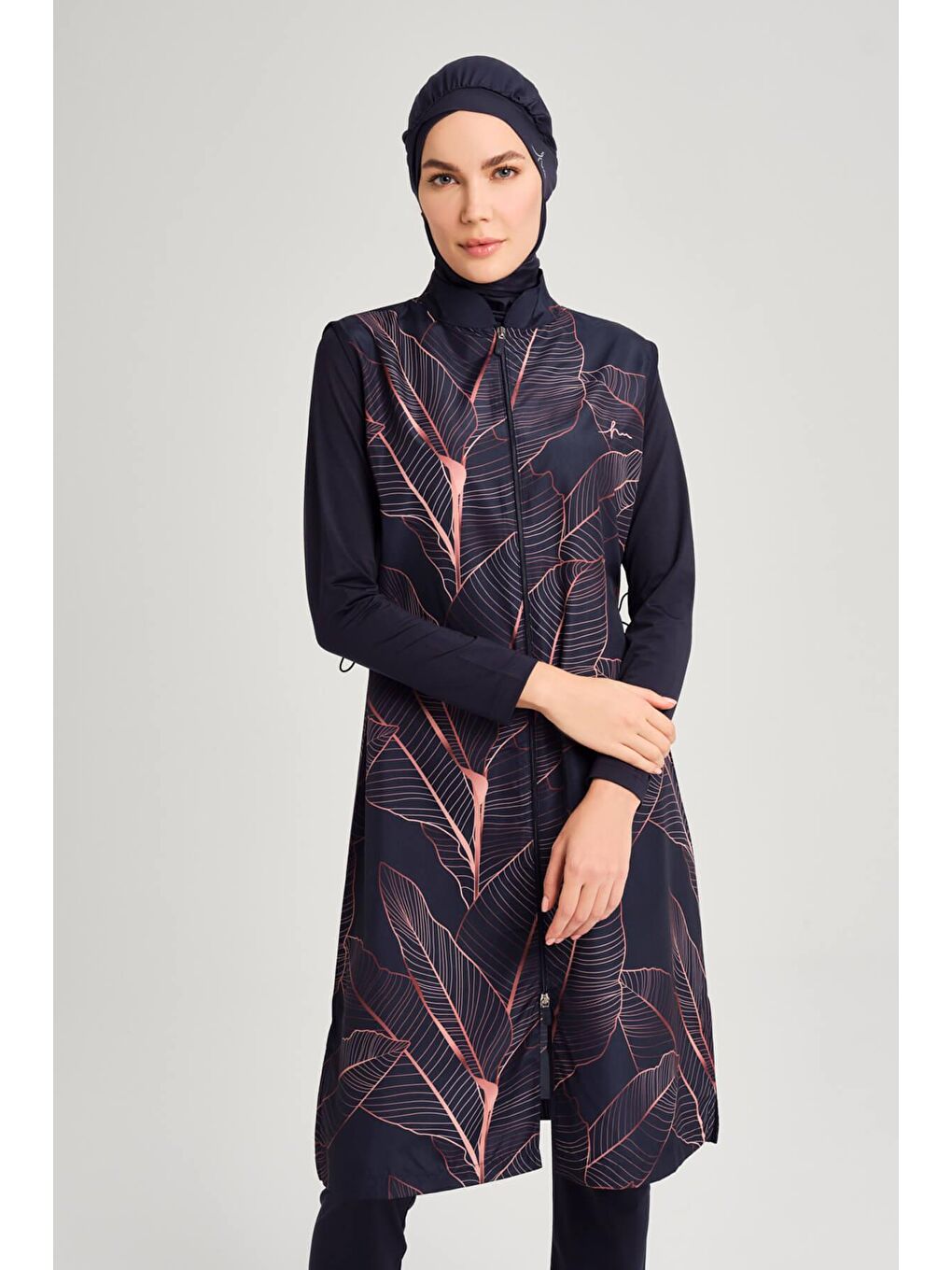جلیقه آبی سرمهای طرح برگ، تاپ مایو حجاب کامل، کد ۶۰۸۸
