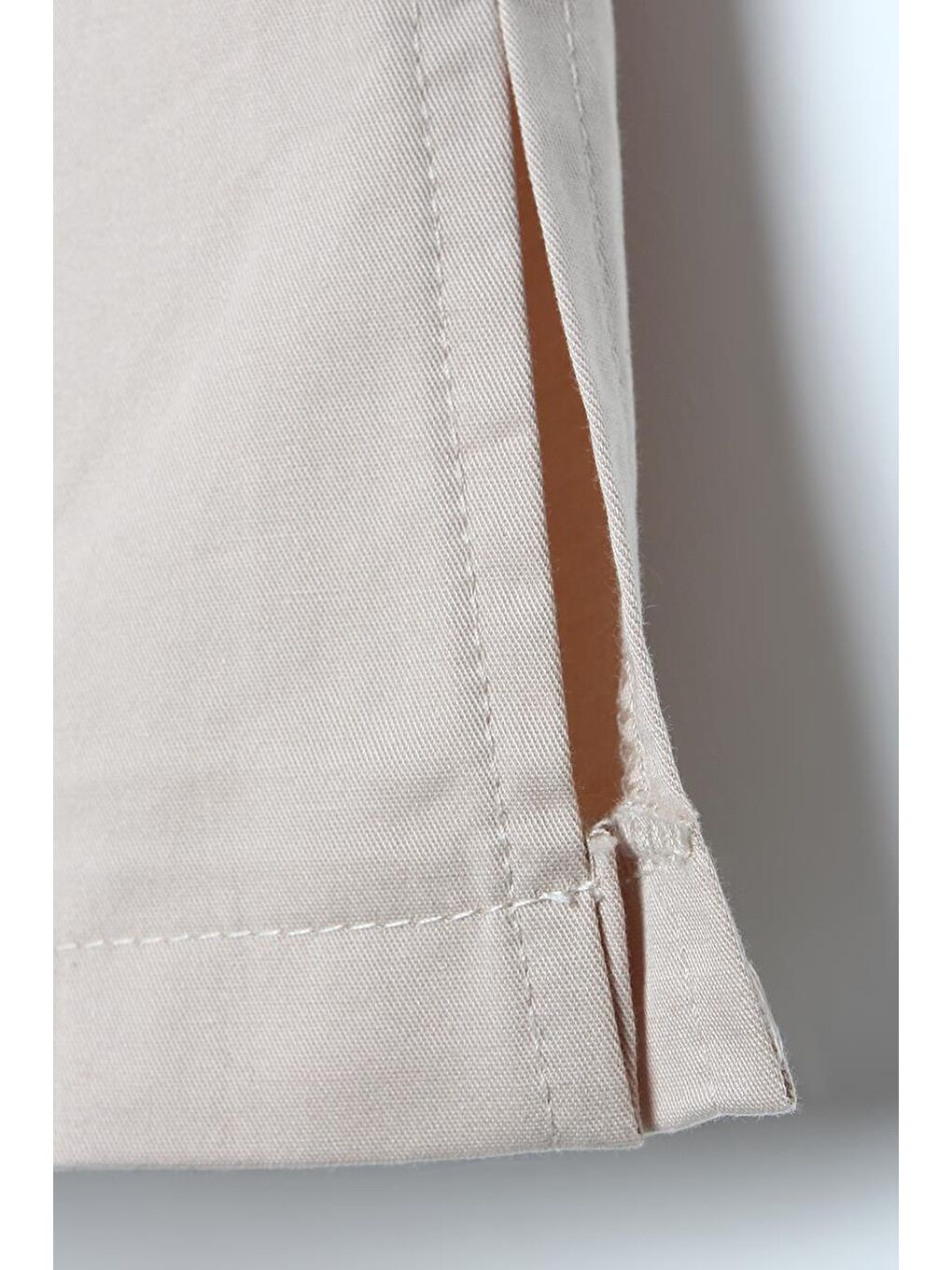 شلوار گشاد نخی بژ طرح سنگ با لبهی چاکدار و طرح آهنی و جنس الاستین