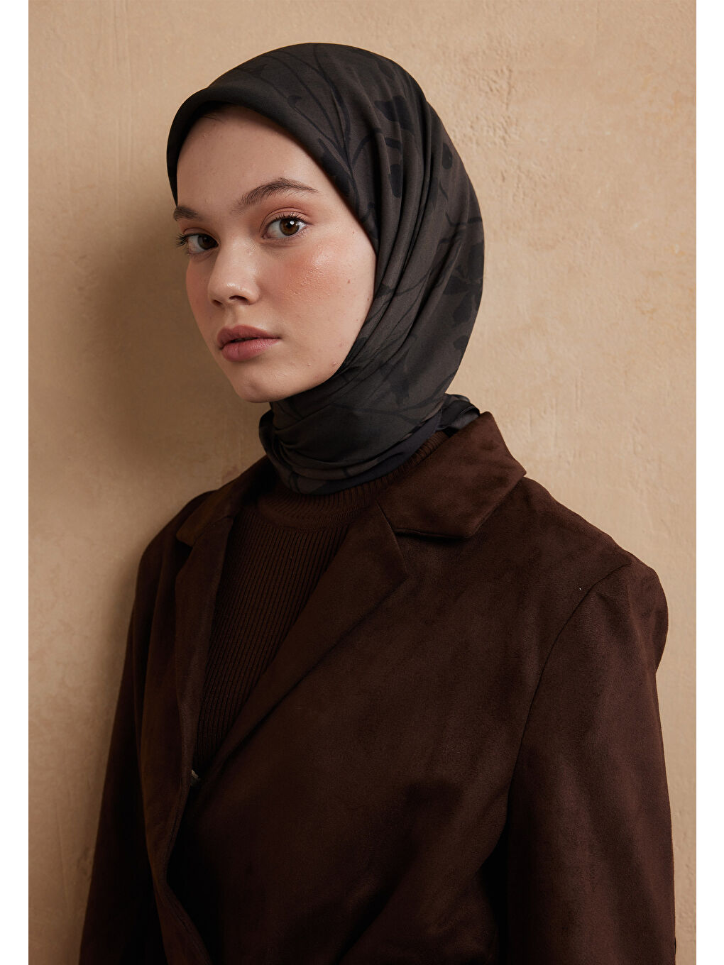روسری ابریشمی نخی طرح جنگل تیره قهوه ای طرح قهوه تلخ