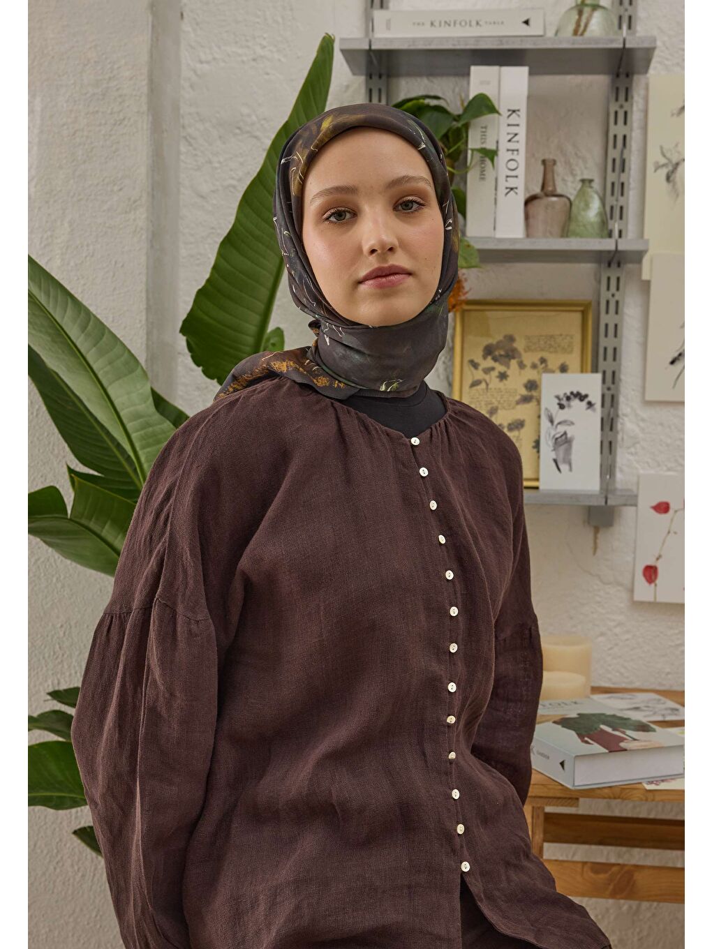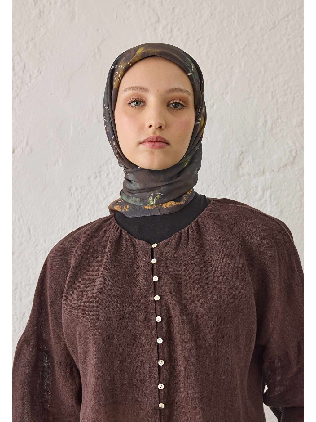 روسری ابریشمی نخی طرح لوتوس قهوهای