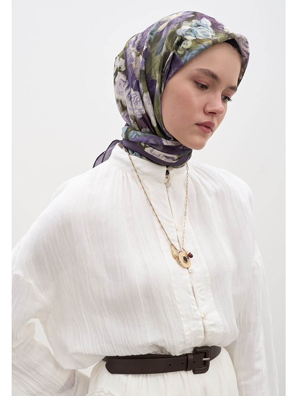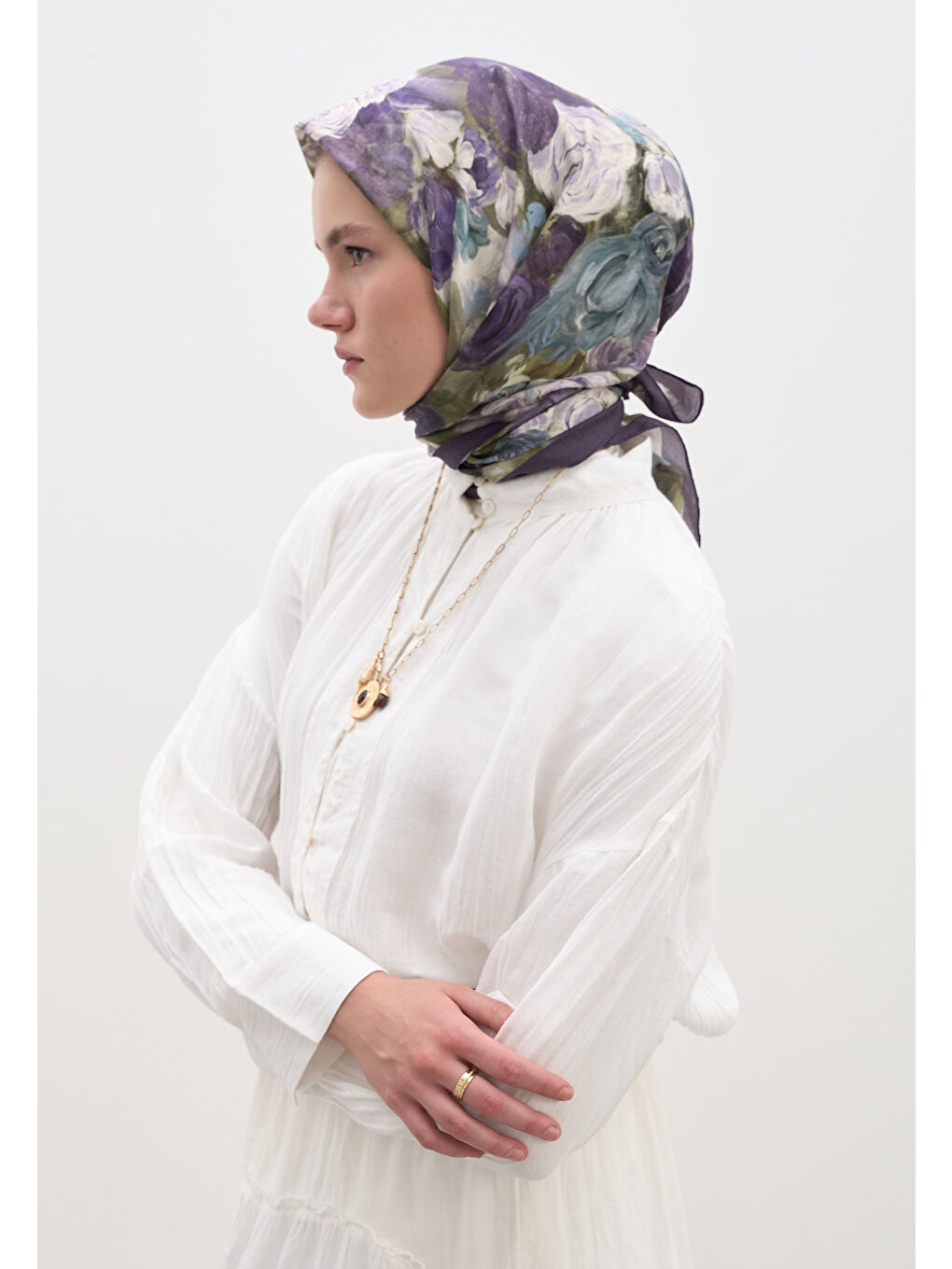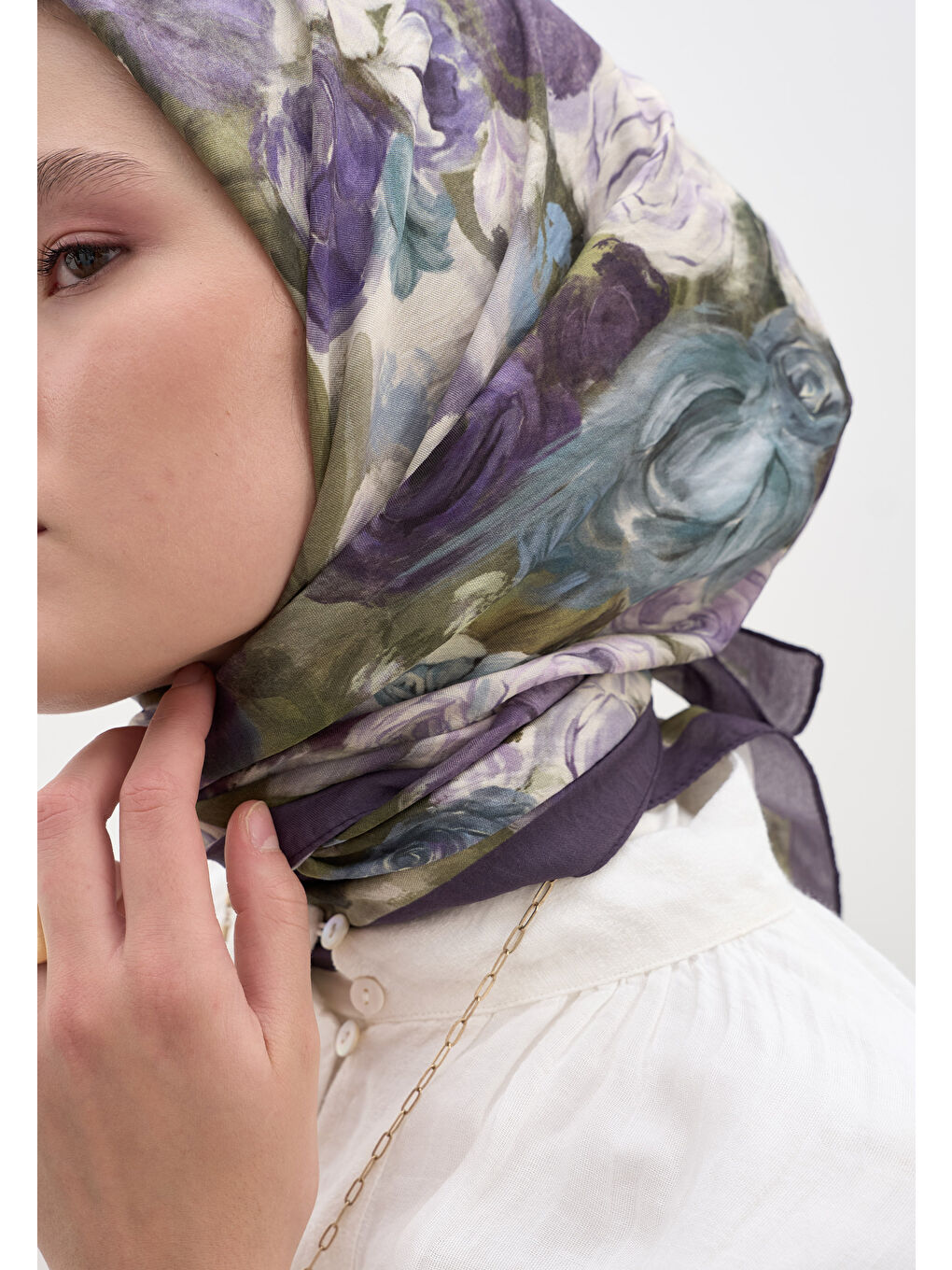 روسری نخی ویسکوز طرح رز نسیم، بنفش بادمجانی