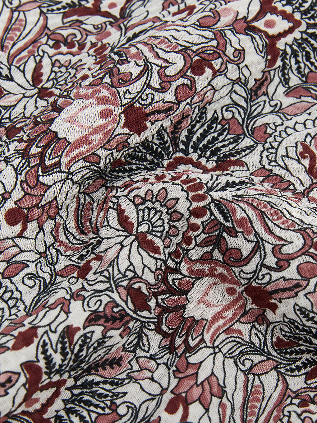 شال زنانه دارای نقوشی متشکل از ترکیبی از نقوش گل و برگ است که در تمام سطح آن ادامه دارد.