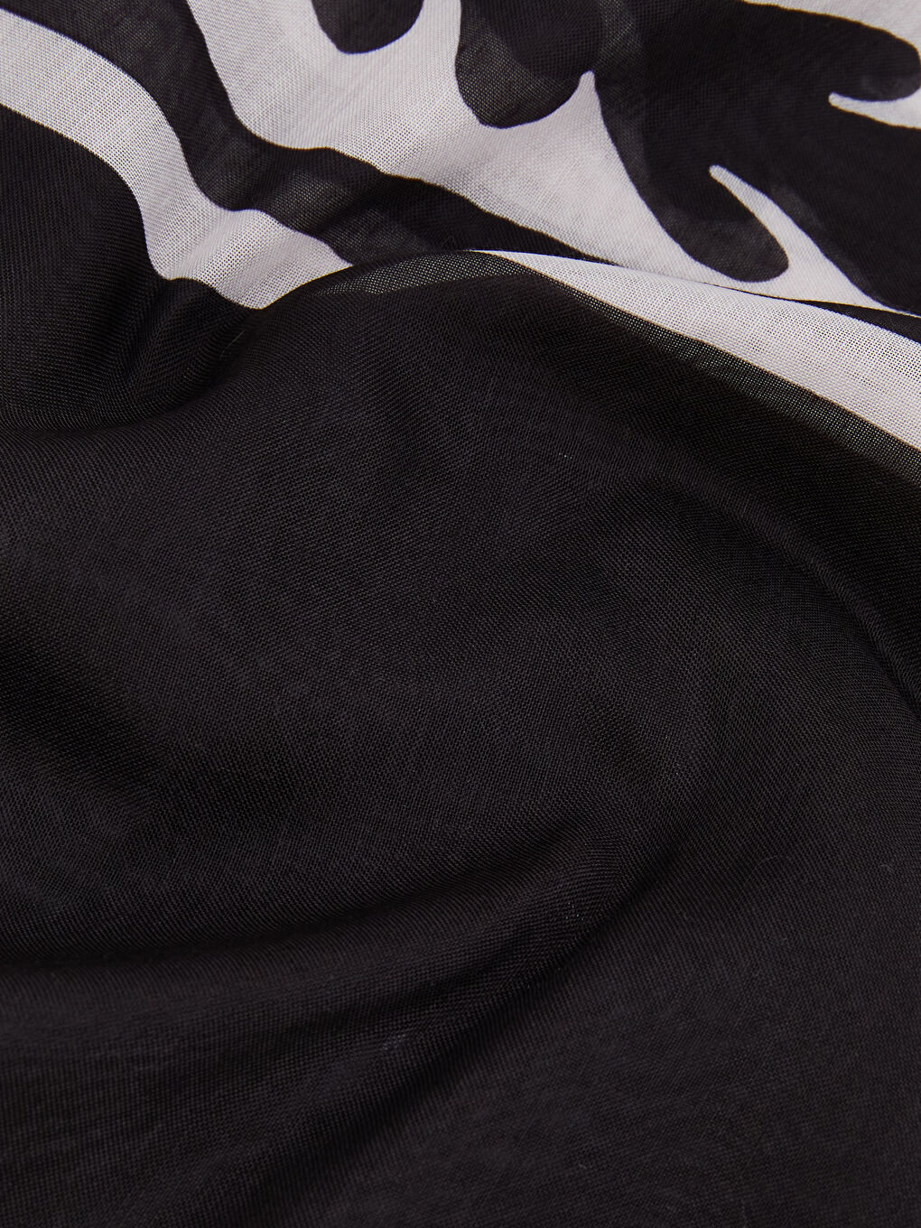 شال زنانه مربع شکل، با پارچه خود طرح دار، در لبه های خود جزئیات حاشیه ای با طرح برگ دارد.