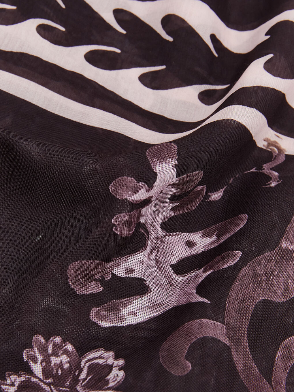 شال زنانه، که طرحهای بزرگ گل و برگ دارد، با طرحی متضاد در لبهها حاشیهدار شده است.