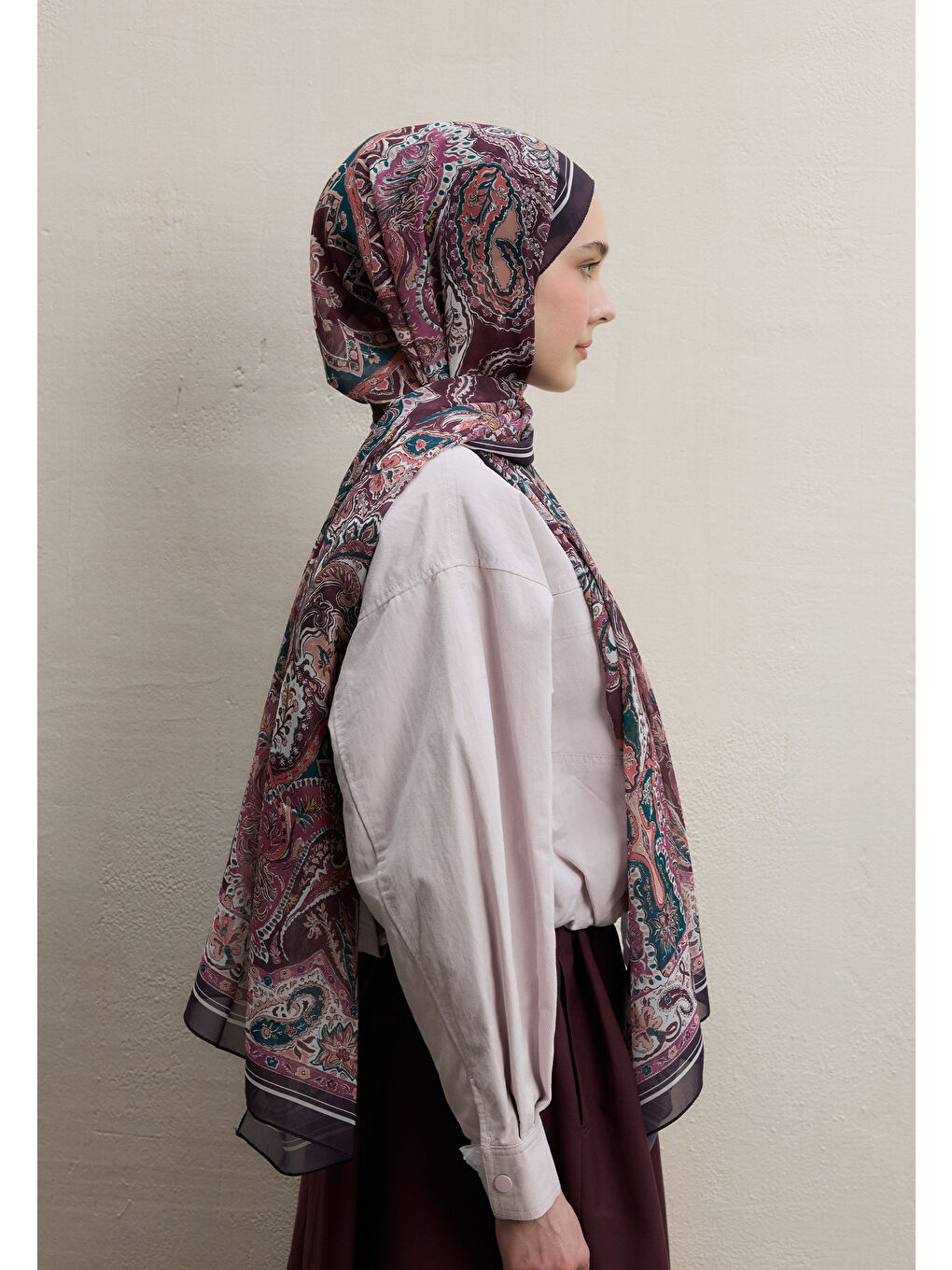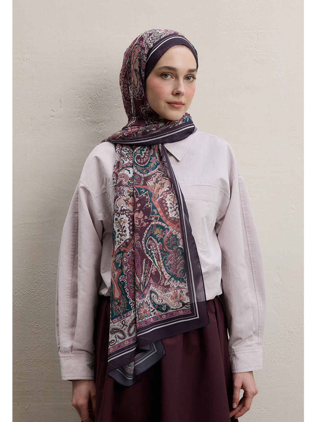شال کرپ ابریشمی طرح بوهمی قرمز تیره طرح آلو کبود
