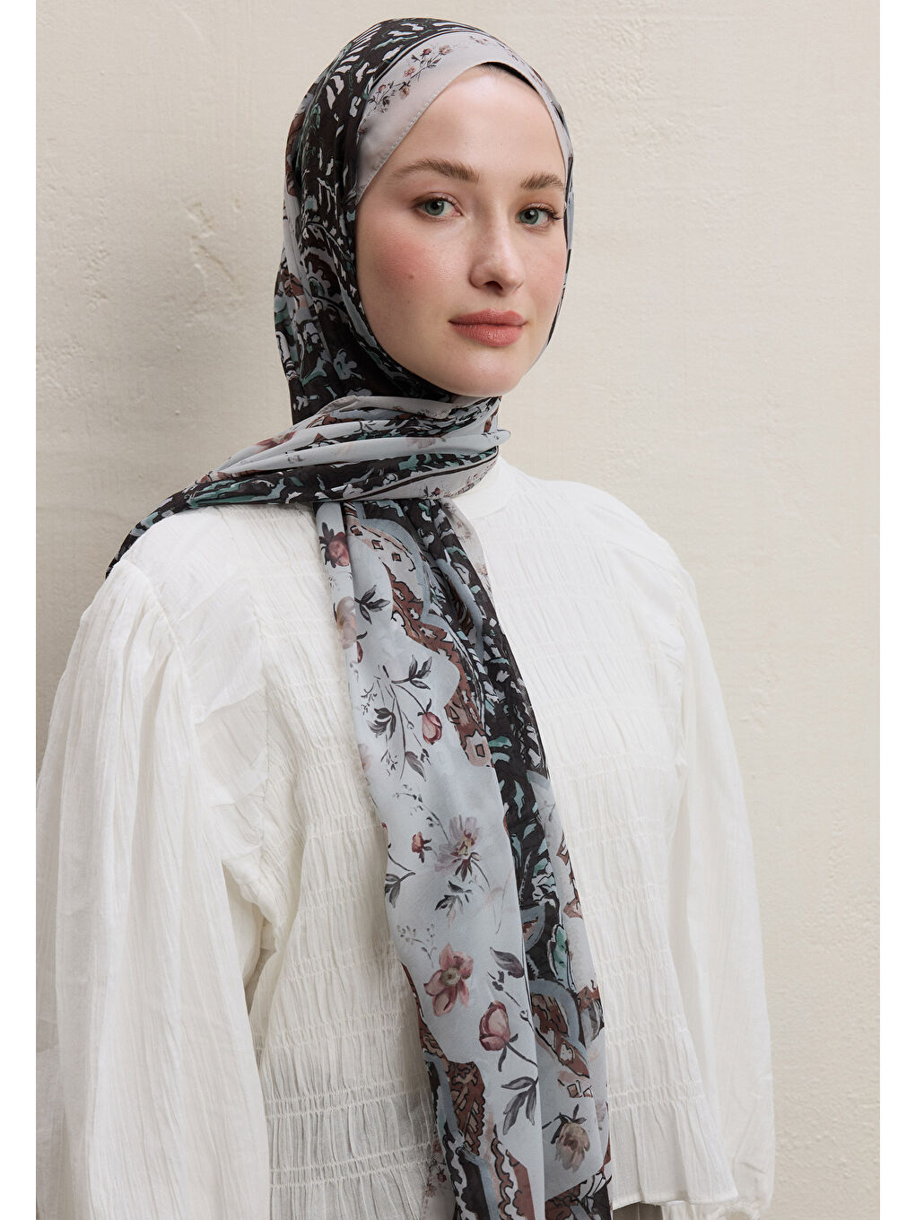 پارچه کرپ ابریشمی. بافت این محصول نازک، سبک و روان است. در صورت استفاده به صورت تک لایه، رنگهای روشن آن نمایان میشود. مناسب برای استفاده در هر چهار فصل. باید با دست و در دمای پایین شسته شود. برای خشک شدن باید پهن شود. ابعاد: ۷۲*۱۹۰ سانتیمتر.
