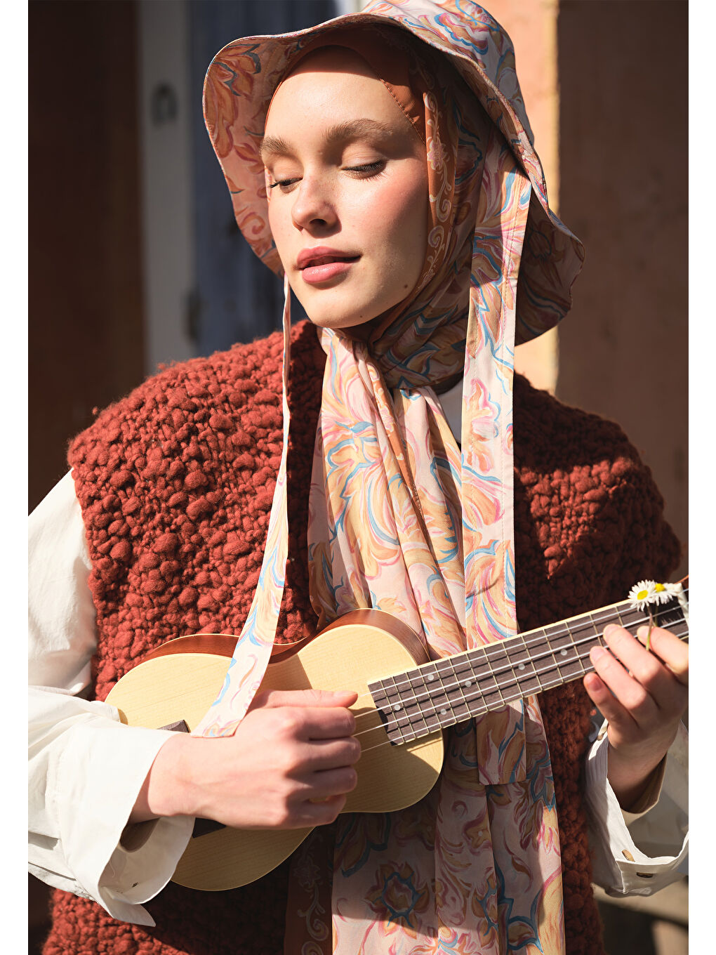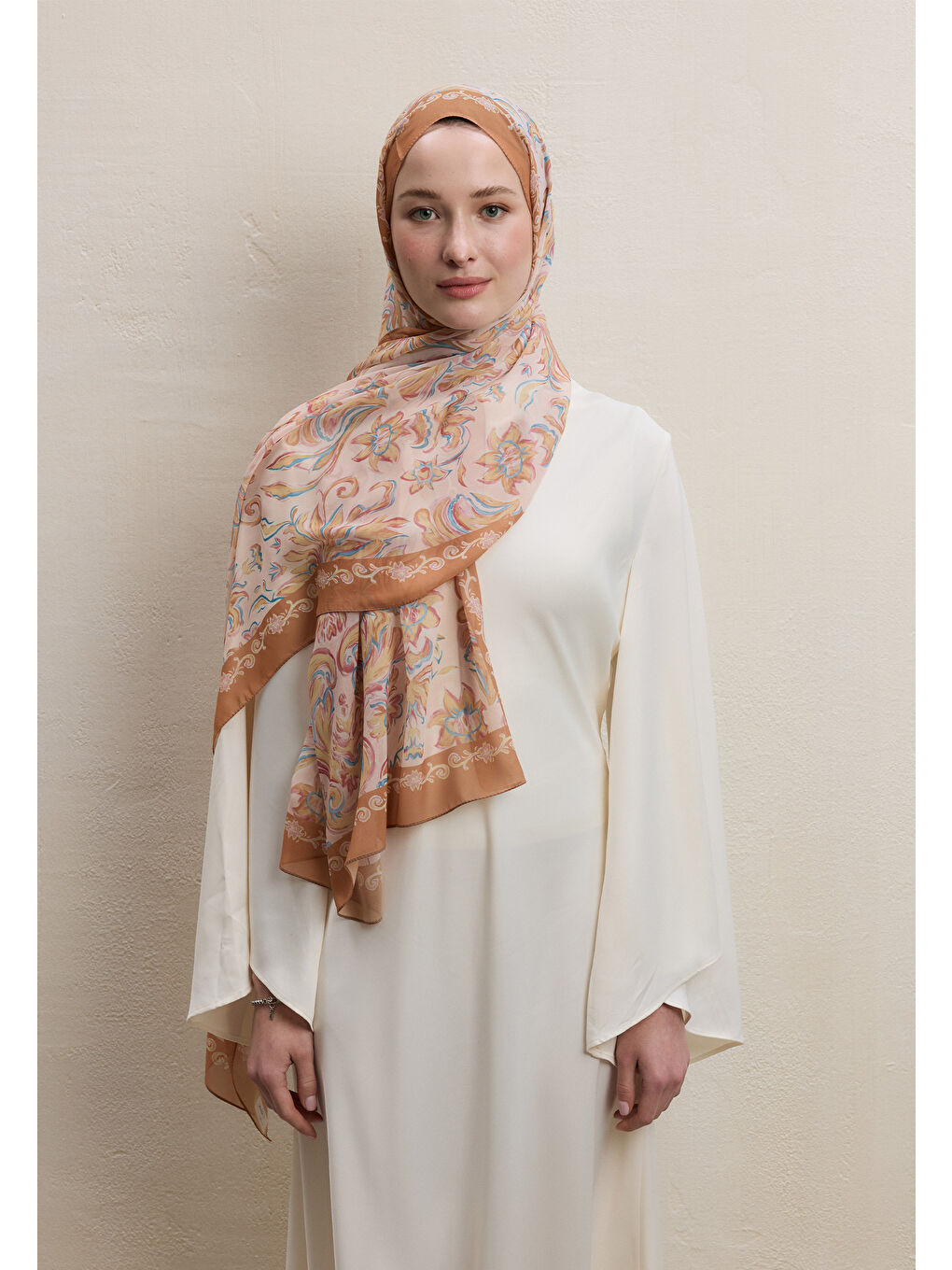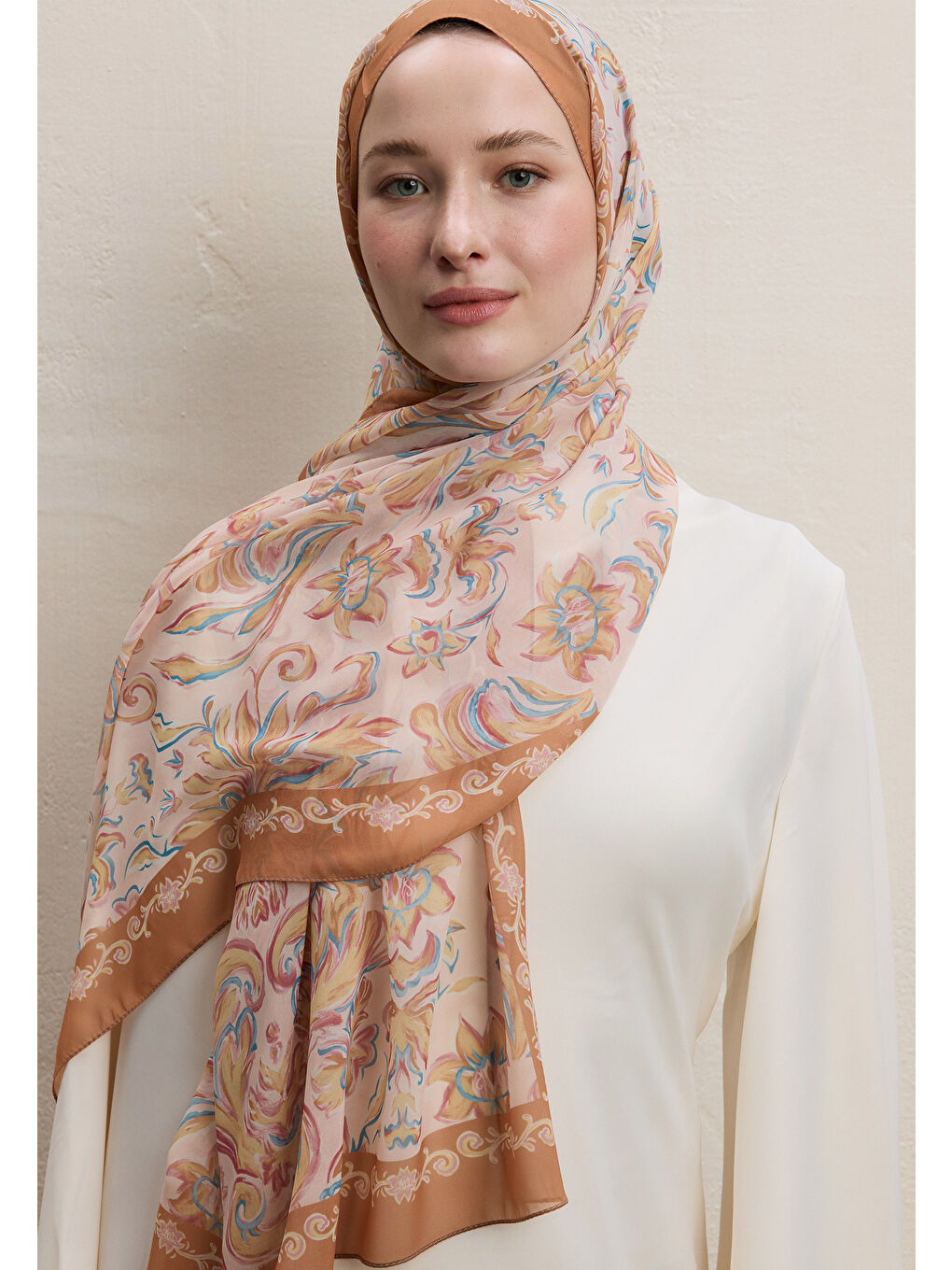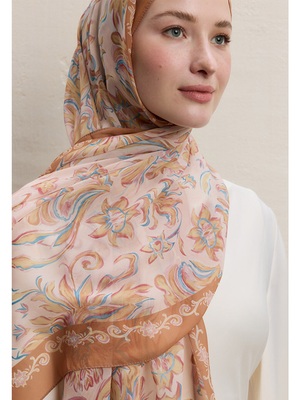 شال کرپ ابریشمی طرح لورا صورتی هلویی