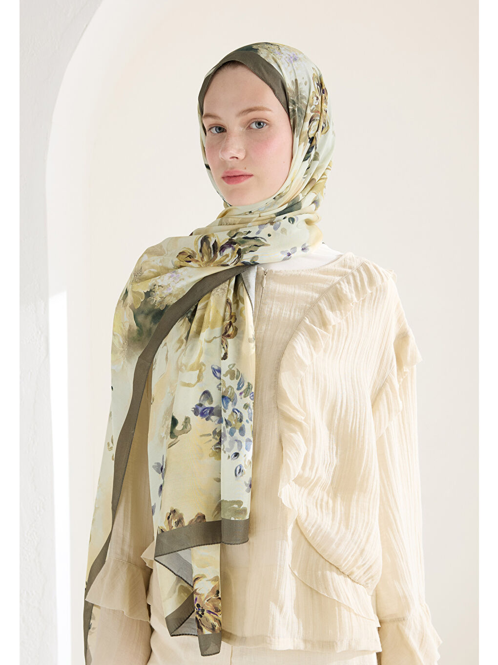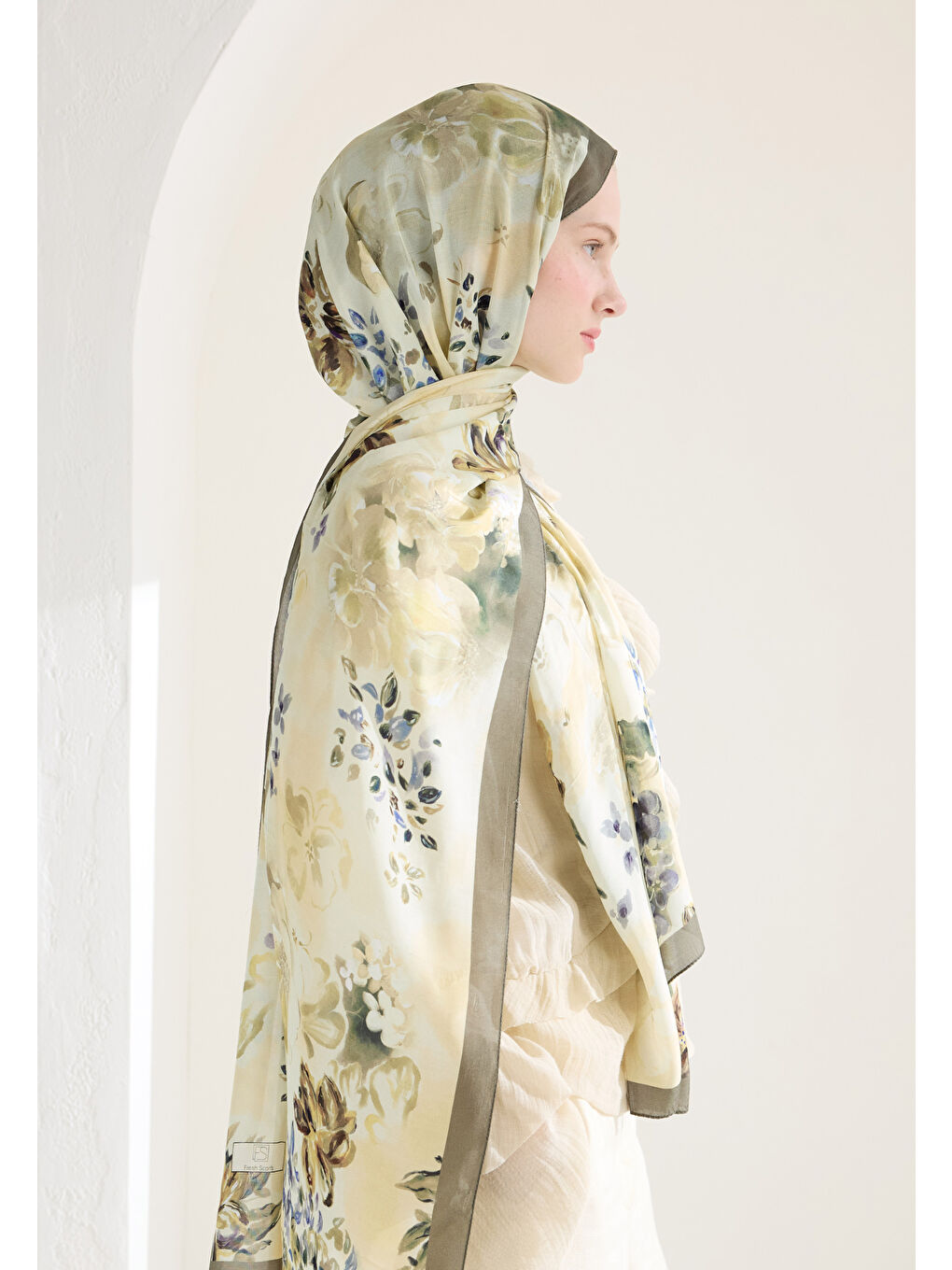 شال ویسکوز مخملی بژ طرح هارمونی مدل Peony