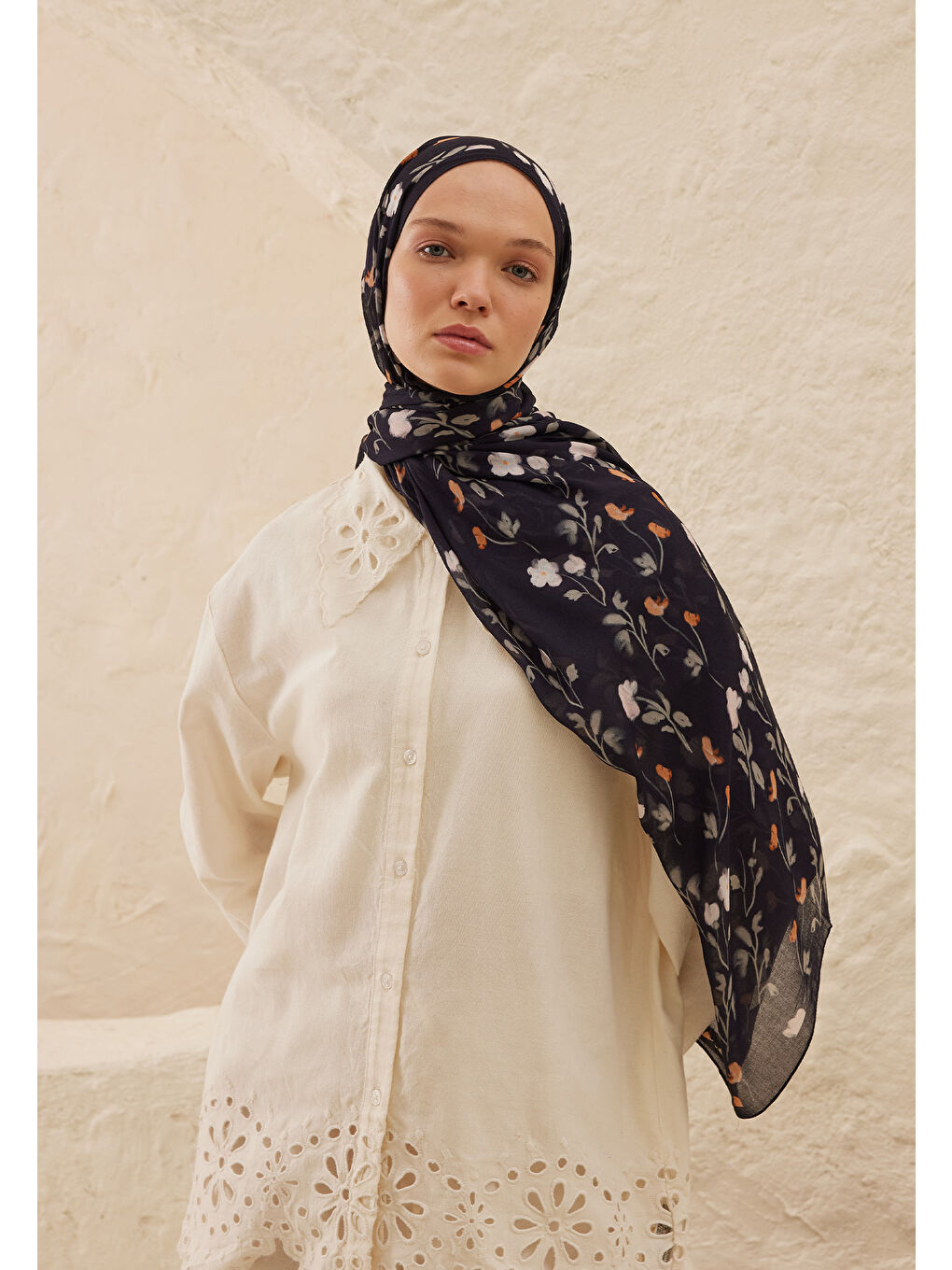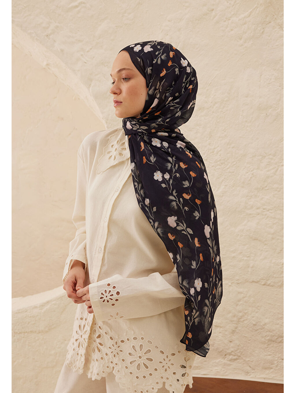 شال رامی طرح گل‌های نرم سرمه‌ای