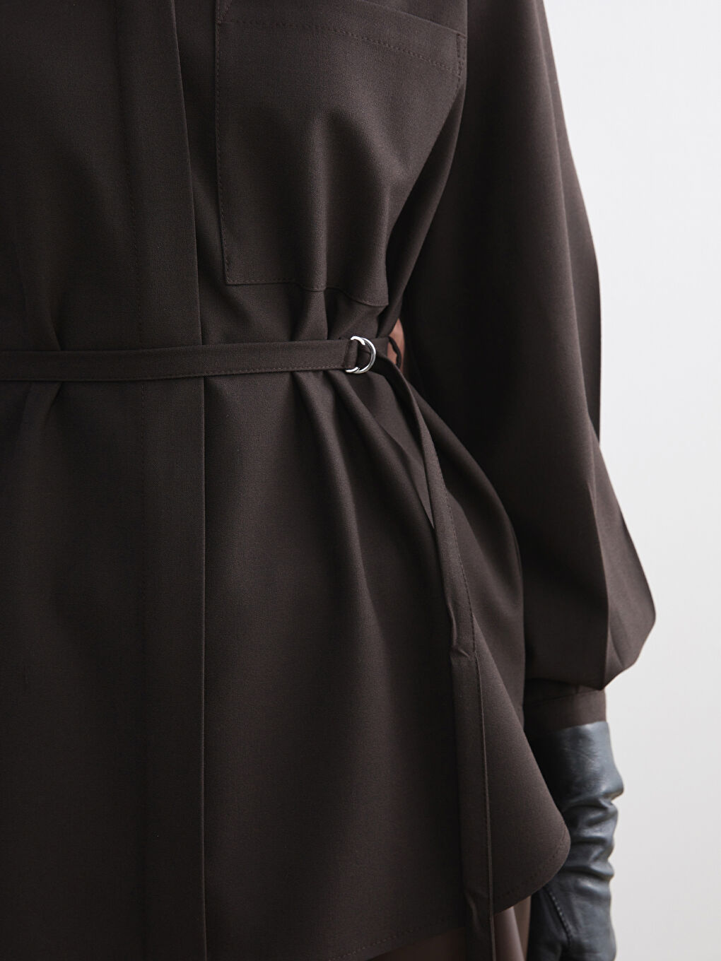 یک تونیک پیراهن زنانه آستین بلند با یقه پیراهنی، دکمه مخفی در جلو، یک جیب تکی روی سینه، کمر کمربنددار و دامن بیضی شکل.