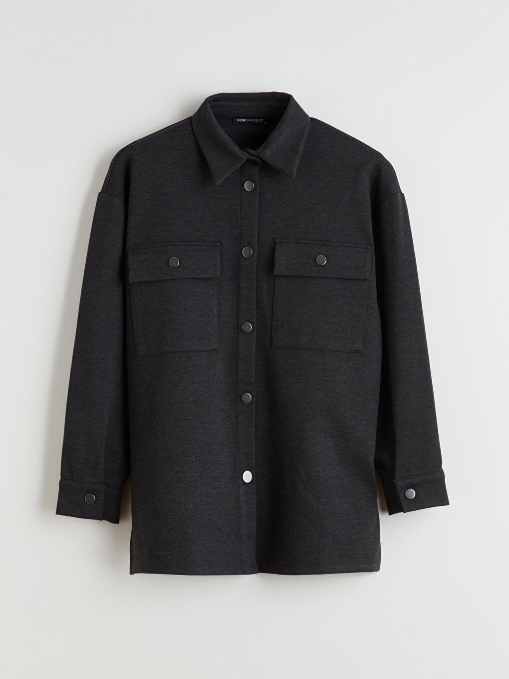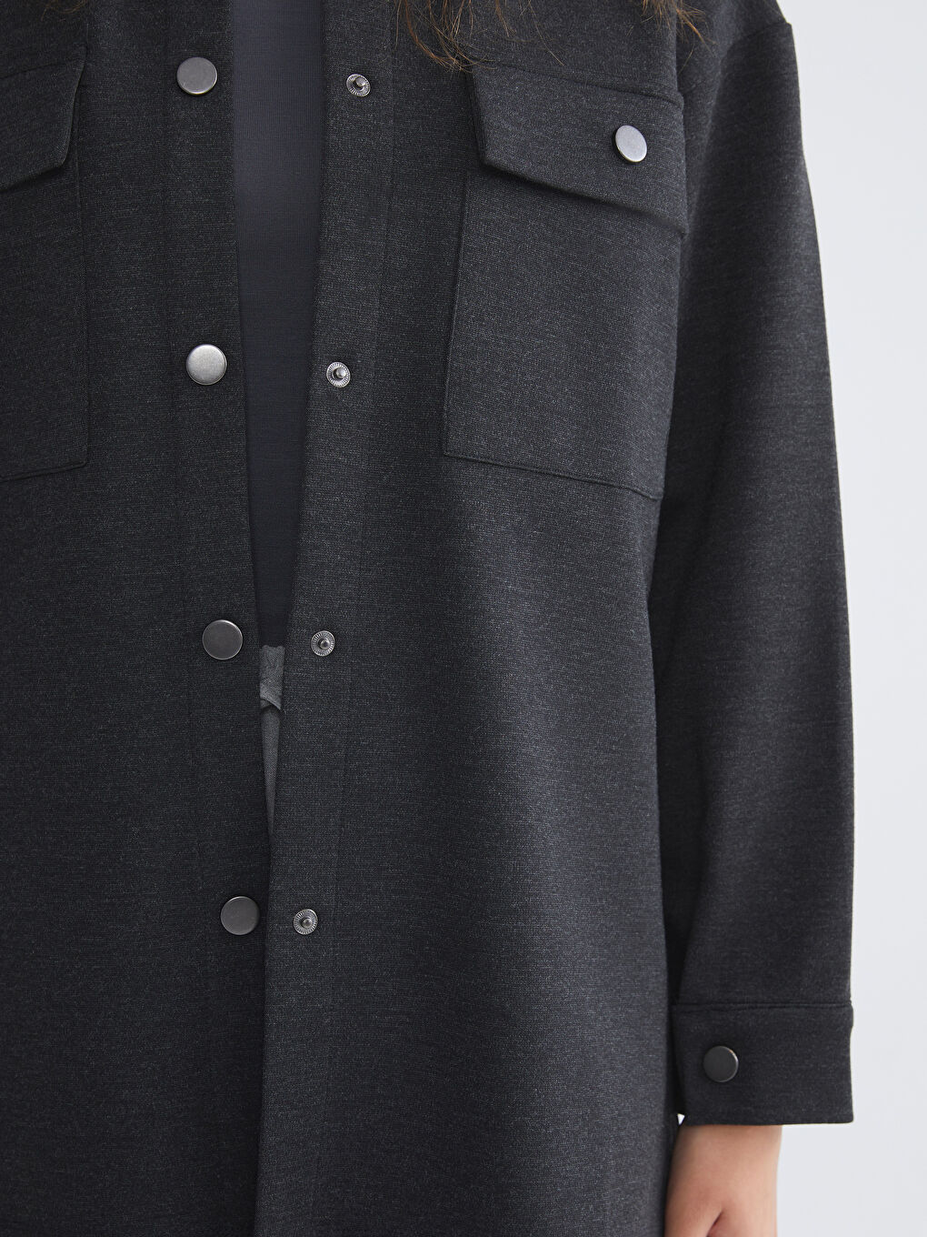 این ژاکت پیراهن زنانه آستین بلند با یقه پیراهنی از پارچه اینترلاک ساخته شده است. در جلو با دکمه فشاری بسته میشود و دو جیب لبهدار روی سینه دارد.