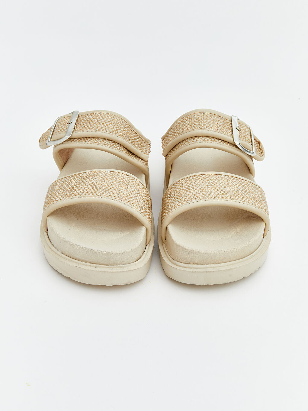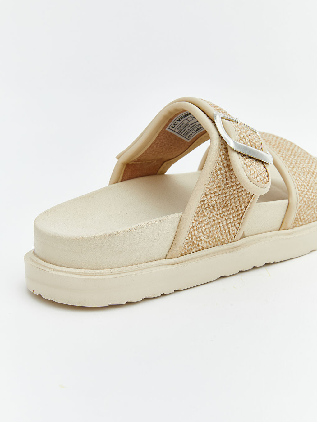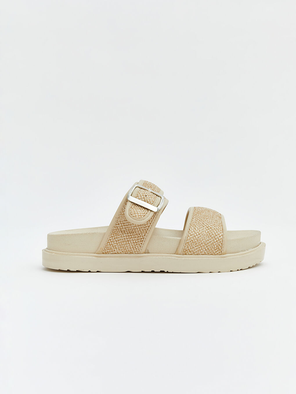دمپایی زنانه کف ضخیم، دارای طرح دو بند با بافت حصیری و سگک‌های فلزی قابل تنظیم است.