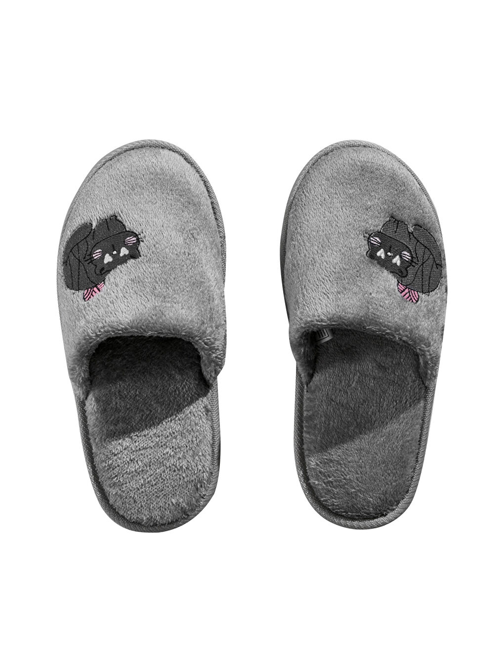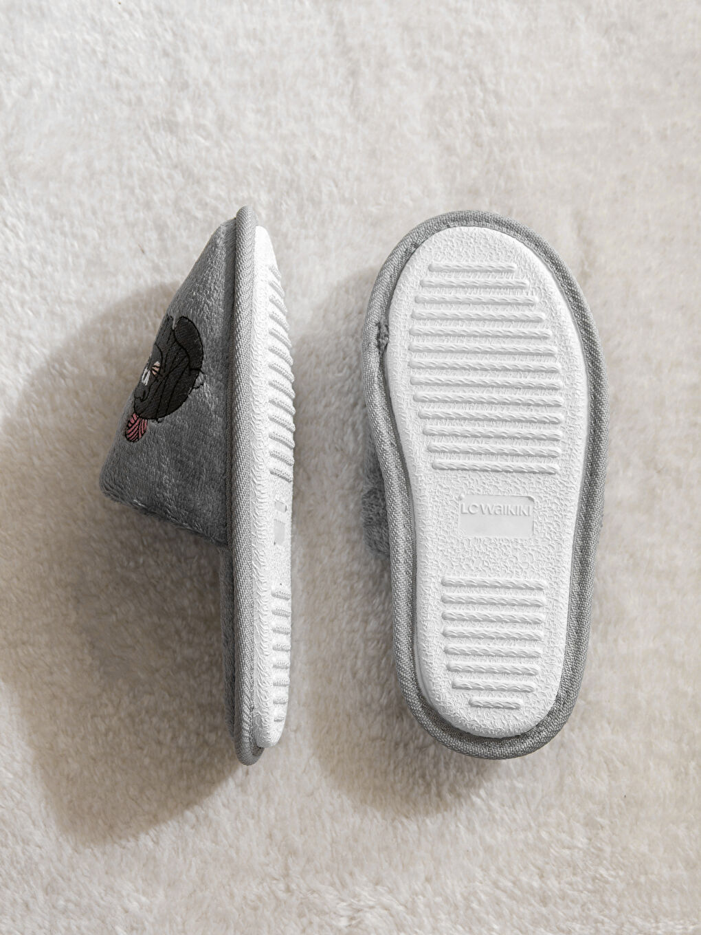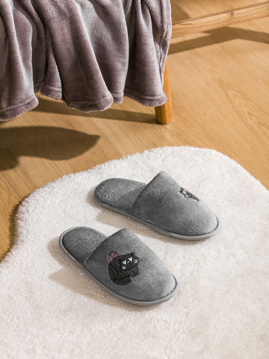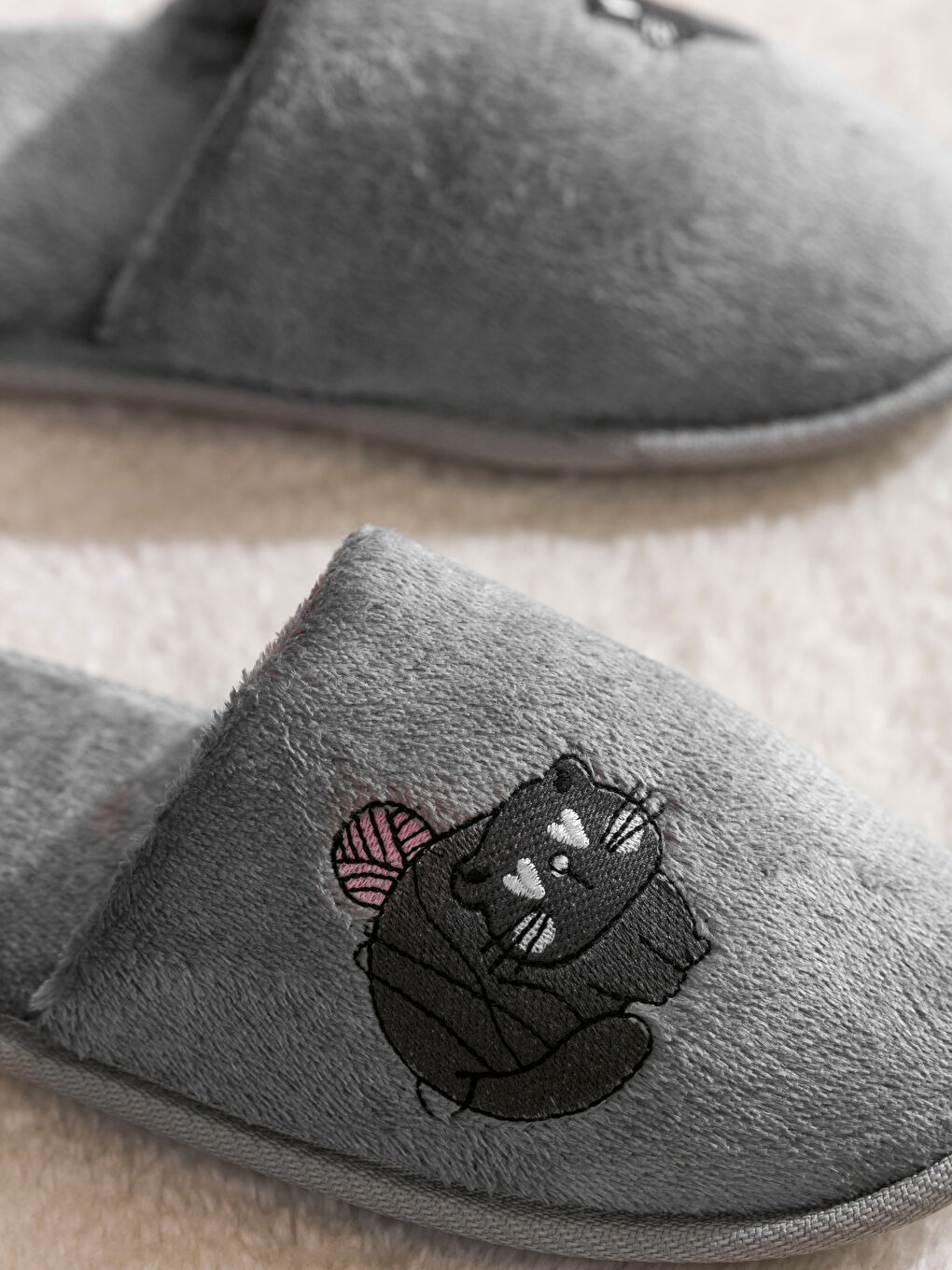 دمپایی خانگی زنانه گلدوزی شده با طرح گربه خاکستری
