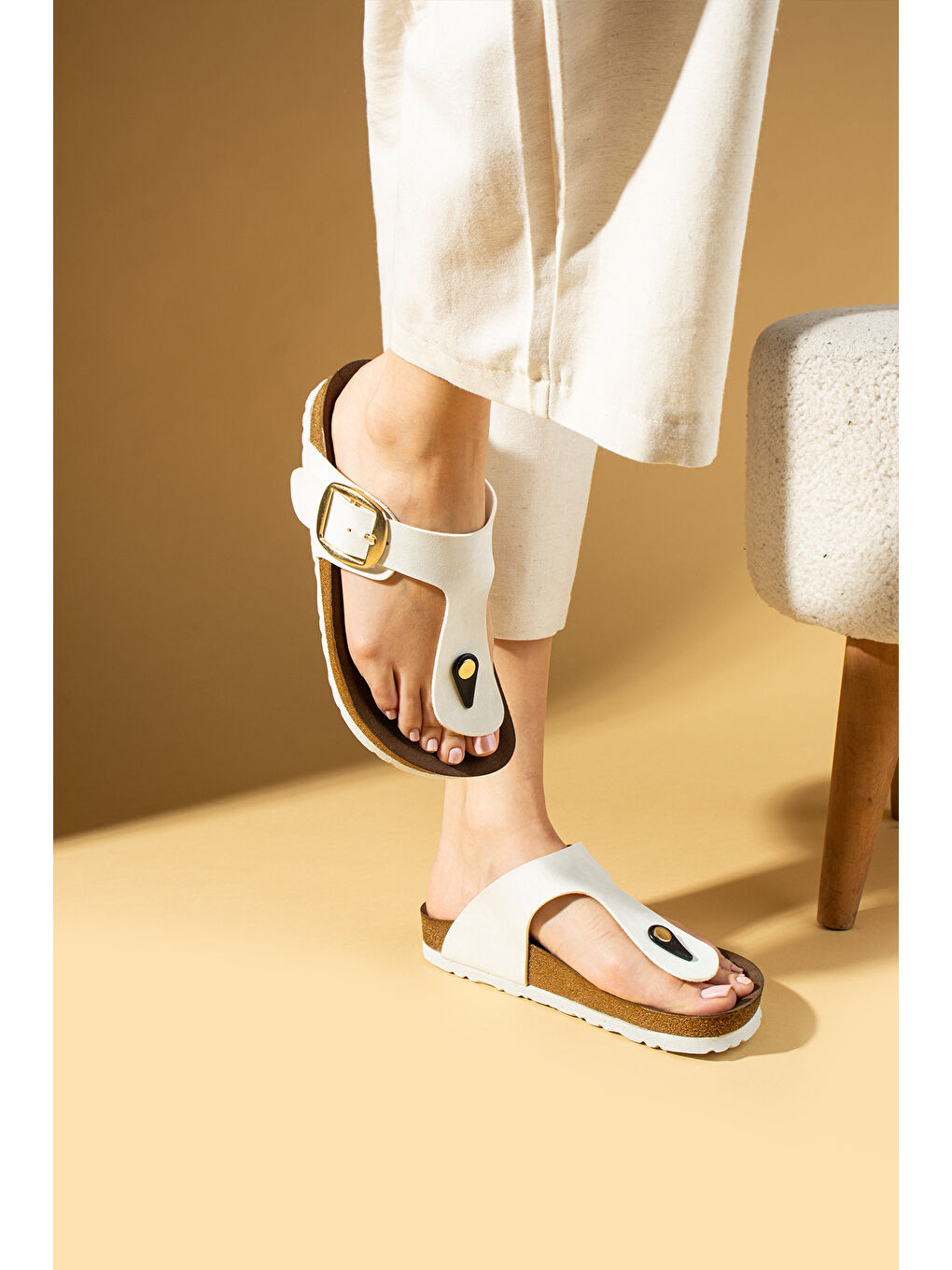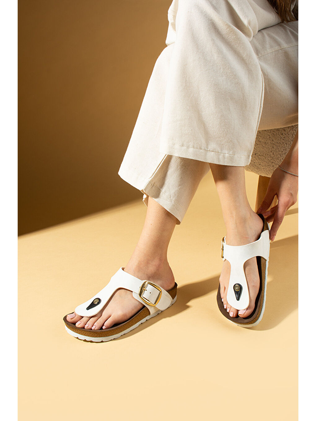 دمپایی لاانگشتی سفید با سگک طلایی و کفی راحت زنانه 011-710-25Cilt