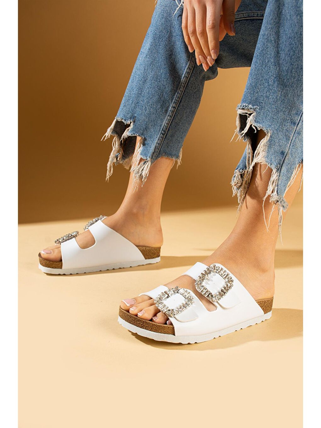 دمپایی راحتی زنانه با زیره چوب پنبه‌ای سگک‌دار سفید طرح سنگ 011-108-24