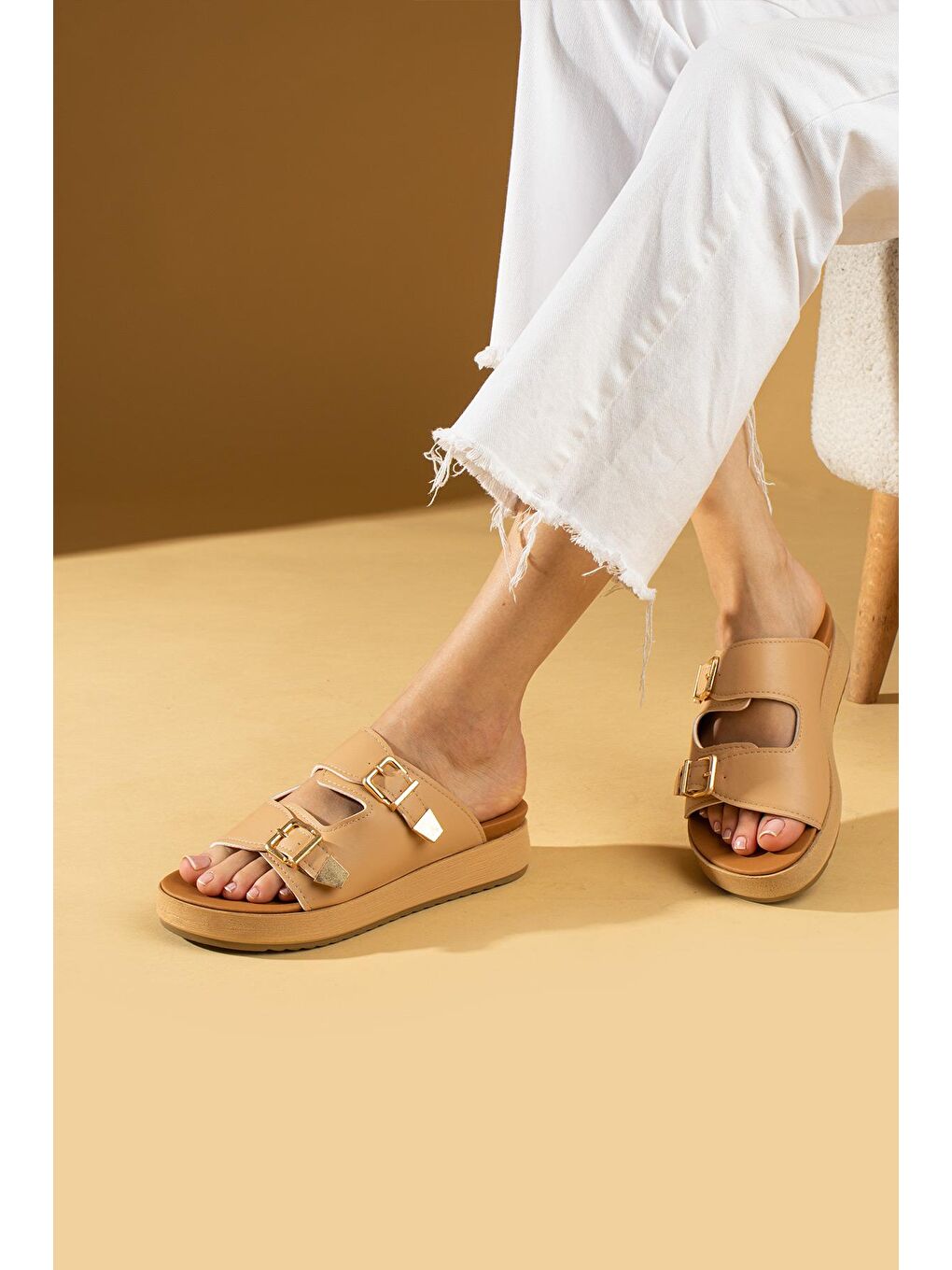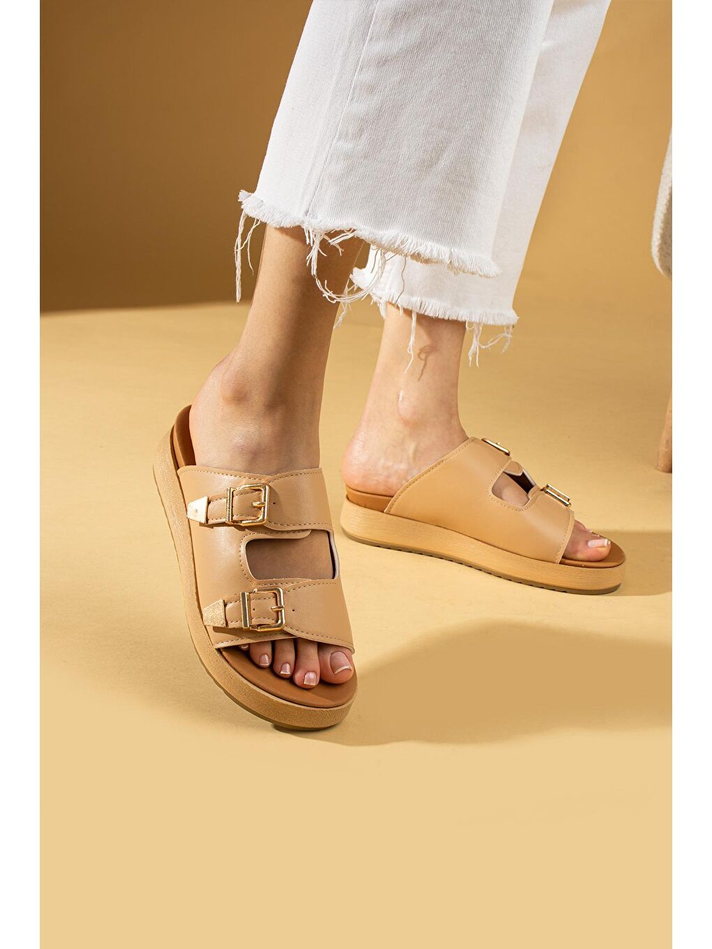 دمپایی راحتی زنانه با سگک دوبل طلایی بژ