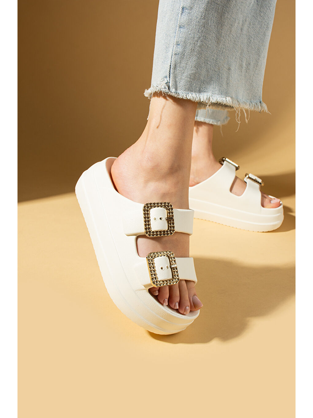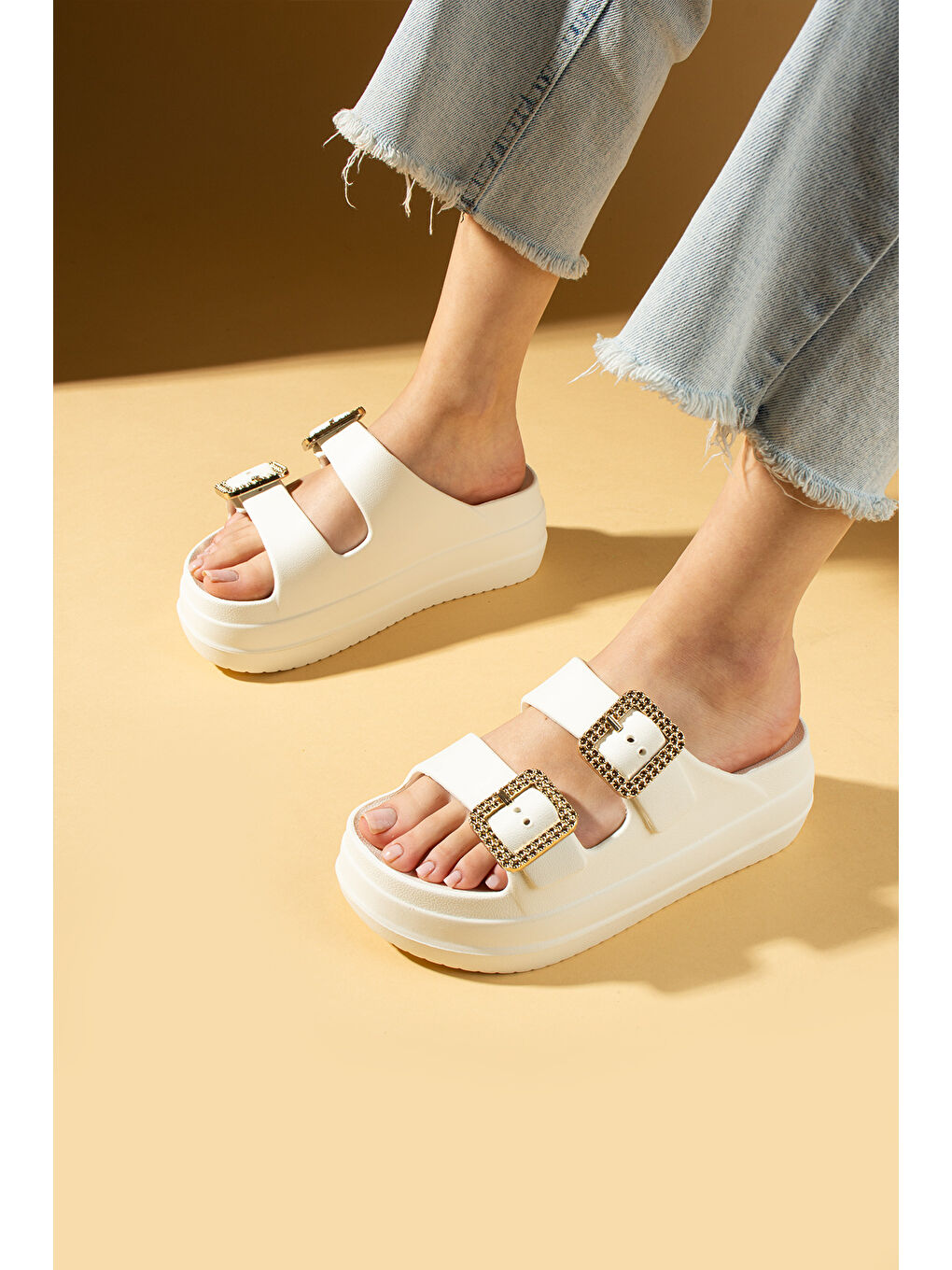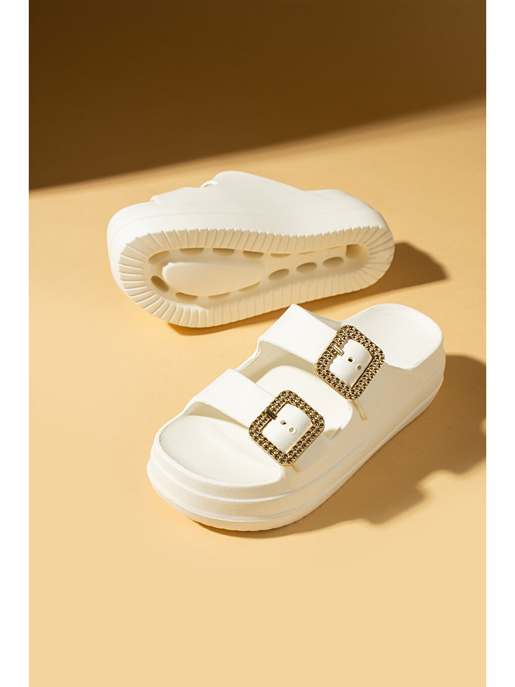 دمپایی زنانه ضخیم بژ، زیره اوا، سگک طلایی قابل تنظیم دوتایی، 011-03-25