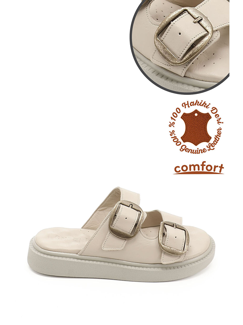 دمپایی راحتی زنانه چرم اصل سگک‌دار بژ-CAMEL