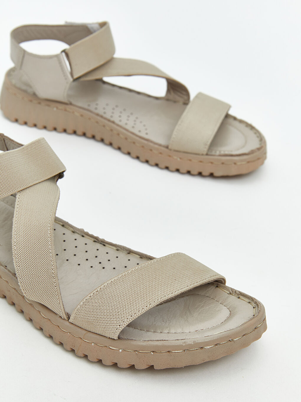 صندلهای زنانه دارای بندهای ضربدری الاستیک، بند دور مچ پا قلابدار و کفی صاف و دندانهدار هستند.