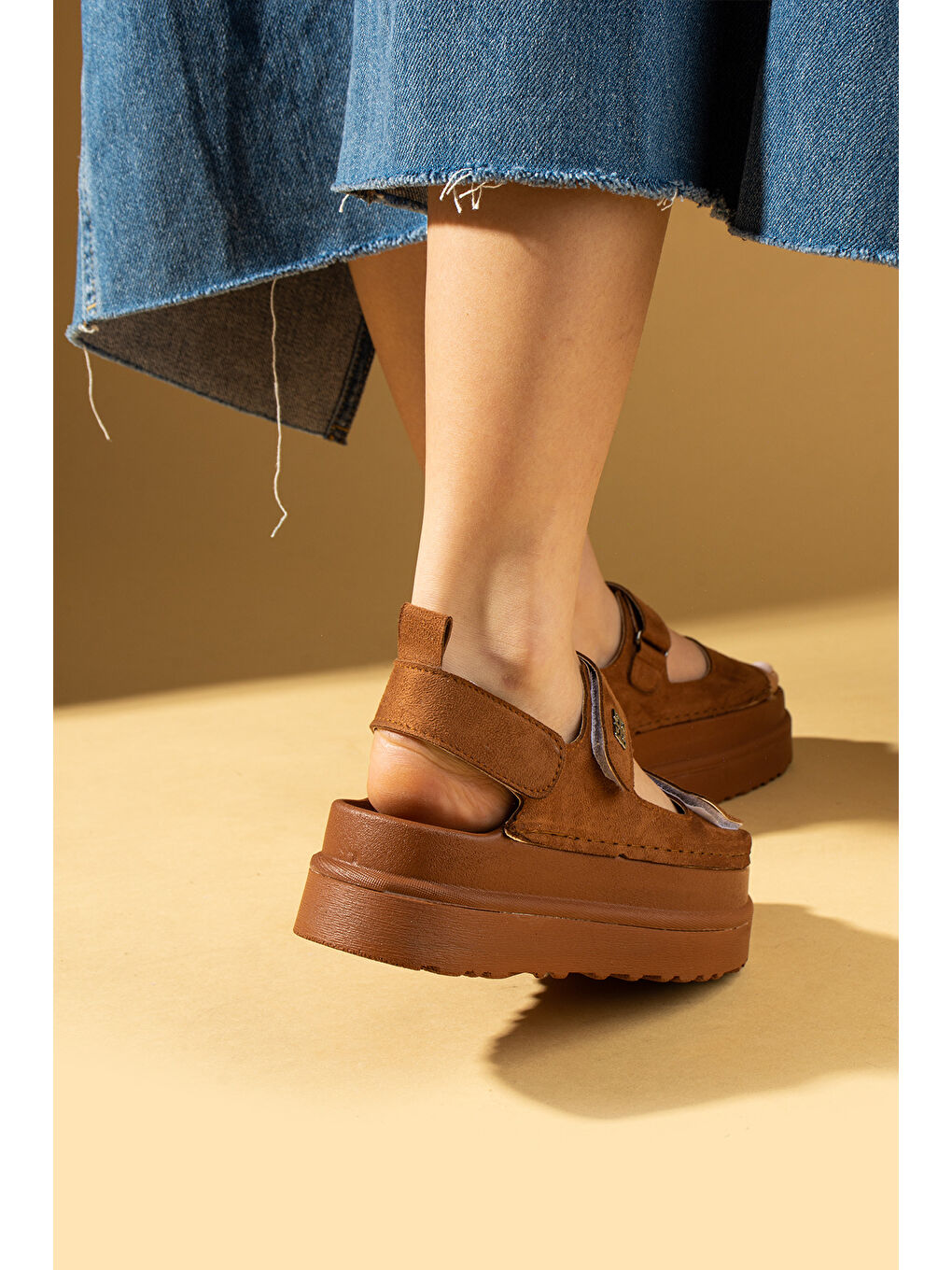 صندل زنانه قهوهای ضخیم با کفی قابل تنظیم چسبی ولکرو، جنس جیر، کد 024-025-25