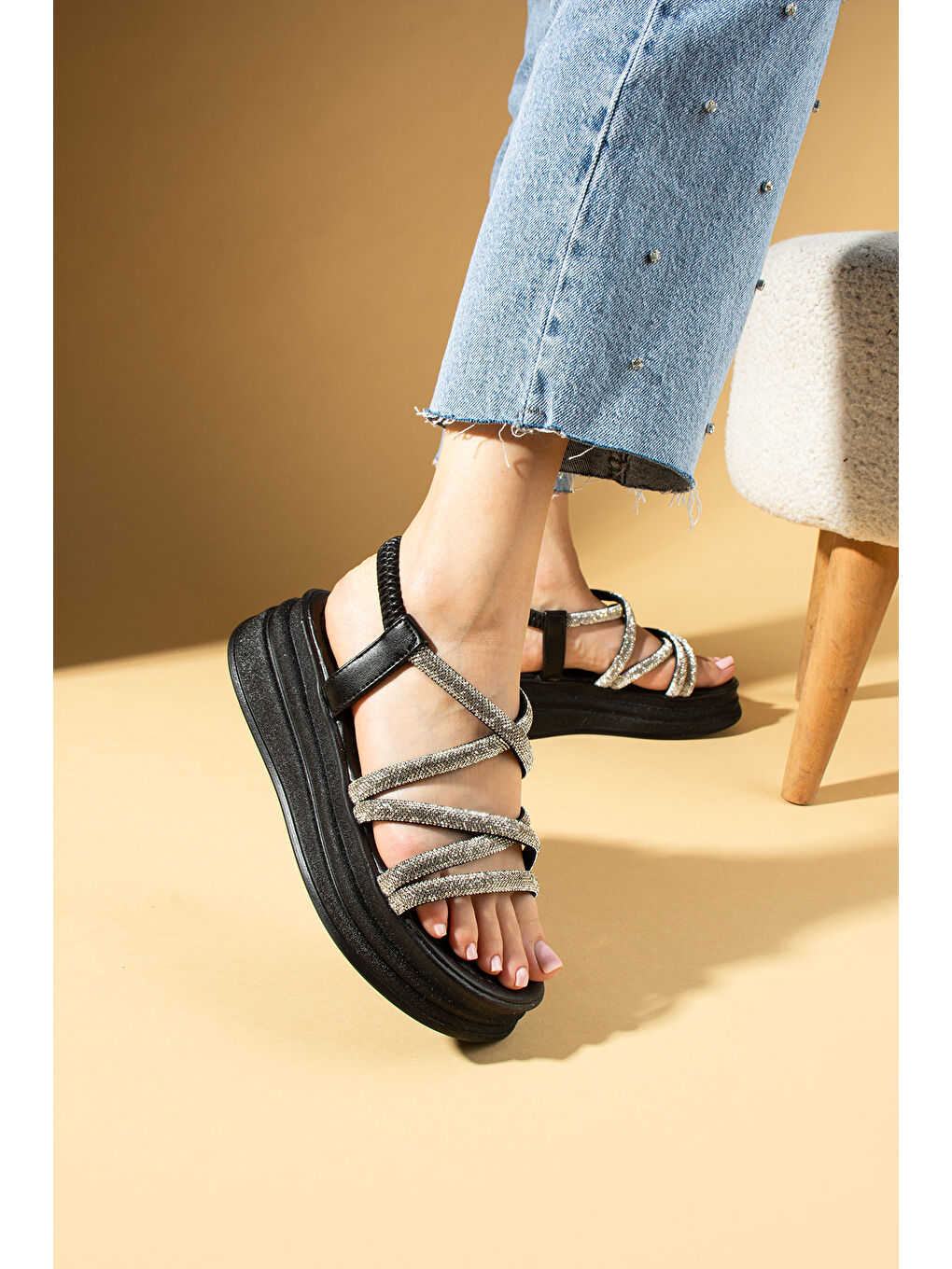 صندل زنانه چند بند و کشی مشکی طرح سنگ مشکی، 018-312-24 Stone